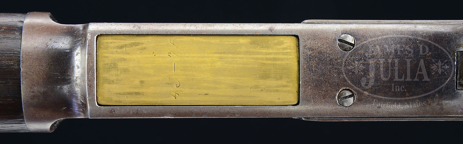 RARE WINCHESTER MODEL 1876 SADDLE RING CARBINE SOLD TO THE CANADIAN GOVERNMENT WITH FACTORY LETTER AND MARKED “GOVERNORS GUARD” ON THE COMB.SN 44472. Cal. 45-75. Standard Grade carbine with 22″ rnd bbl barleycorn front sight & 1,000 meter Spanish rear sight, graduated 1 to 5 on left side of base and 2 to 10 on the standing leaf. Receiver is 3rd type with integral dust cover rail & 3rd type dust cover. Receiver has a stud and ring in the left side. Mounted with nicely figured, uncheckered American walnut with straight stock & carbine buttplate without trap and full length forearm that has a special blued steel nose-cap with one band secured by a spring keeper. Buttplate is without trap, however the buttstock has the cleaning rod recess under the buttplate and it contains as small piece of paper with handwritten name and address “Leland B. Griswold, 239 N.Pinerst St., Milwaukee, WIS, Jan 4, 1944, Winchester 1876 carbine #44472.”. Comb of the buttstock just forward of the buttplate tang has very worn, barely visible letters stamped into the wood that are only visible under strong light in the right circumstance. The letters appear to be “GOV GA 31”. Accompanied by a Cody Firearms Museum letter which identifies this firearm as a carbine, received in the warehouse April 8, 1885 and shipped the same day with 399 other arms to order no. 19819. There is a notation in the letter “Please see the attached research regarding Royal Canadian Mounted Police carbines.” That information is attached and contains a brief history of the Governor General’s Body Guard which was a militia unit organized under the Militia Act of 1793 that mandated that all healthy male citizens ages 16-60 yrs were required to serve. After the British Army completely left Canada in 1870, the Canadian Govt raised a small regular force and reorganized the militia cavalry into regiments. It was apparently during this time that the Canadian govt ordered the model 1876 carbine to arm the North West Mounted Police as well as the militia cavalry units. This carbine was part of a 399 gun shipment ordered on April 3, 1885. These carbines saw hard frontier service especially during the Riel Rebellion & later patrolling the Canada/U.S. borders and remained in service until 1914. Few of these carbines survive today in orig configuration with orig finish. After their lengthy service with the Canadian Militia they were sold as surplus. Also accompanied by an orig 3-piece brass & steel cleaning rod. CONDITION: Very fine. Bbl retains 96-97% strong restored blue. Receiver and sideplates retain about 80-85% thinning orig blue with sharp edge wear, turning silver brown around the carry point on the bottom front. Hammer retains strong case colors turned dark on top edge. Lever retains what appears to be about 70% of a blue finish. Wood is sound with common use nicks, dings and scratches & shows most of a lightly restored finish. Mechanics are crisp. Worn, dark bore with moderate pitting. Cleaning rod is fine. 52506-7 (15,000-25,000) – Lot 1059 Click here to view provenance