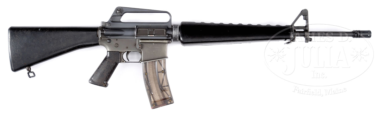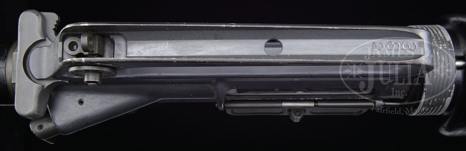 **EARLY MANUFACTURED COLT AR-15 AMNESTY REGISTERED AS FULL-AUTO MACHINE GUN (FULLY TRANSFERABLE).SN SP01426. Cal. .22 LR. 22″ bbl. Unusual early Colt AR-15 made into a full-auto with painted grey upper receiver and scalloped out markings below Rampant Colt logo with non-factory SN applied upon registration. Rear most selector indication “FULL” has also been inexpertly removed with some kind of a tool. Buttstock with early “rounded” butt configuration and hand grip of the earlier brown Bakelite type composition dark brown/black. Triangular hand guards also of the earlier black composition. Bbl is marked “CHROME BORE”. Upper is marked at rear above charging handle “4 / 486” with “382” in electropencil on top from of carrying handle. Currently installed .22 sub-caliber unit. .223 bolt assembly present. Parts are un-serialized. 10 .22 cal after market magazines included. Part of an estate offering. This is a National Firearms Act item and requires BATF approval prior to transfer. This weapon is fully transferable on an ATF form 3 or 4. CONDITION: Overall appearance and finish is very good with blemishes noted above to lower receiver. Loss of grey enamel paint at high edges and also some chipping of grey paint on hand guard retention ring and left side of lower receiver. Composite parts show some handling marks, but this rifle remains completely serviceable. Mechanics need attention with some looseness to the front hinge pin when upper is swiveled downward. Brilliant bright bore. A nice offering with its .22 conversion included. Although clearly a modified lower assembly, this was amnesty registered and a redacted copy of this original amnesty form is included as provenance with this gun. Very rare and unusual early specimen! 52520-11 JWK (18,000-28,000) – Lot 2087 Click here to view provenance