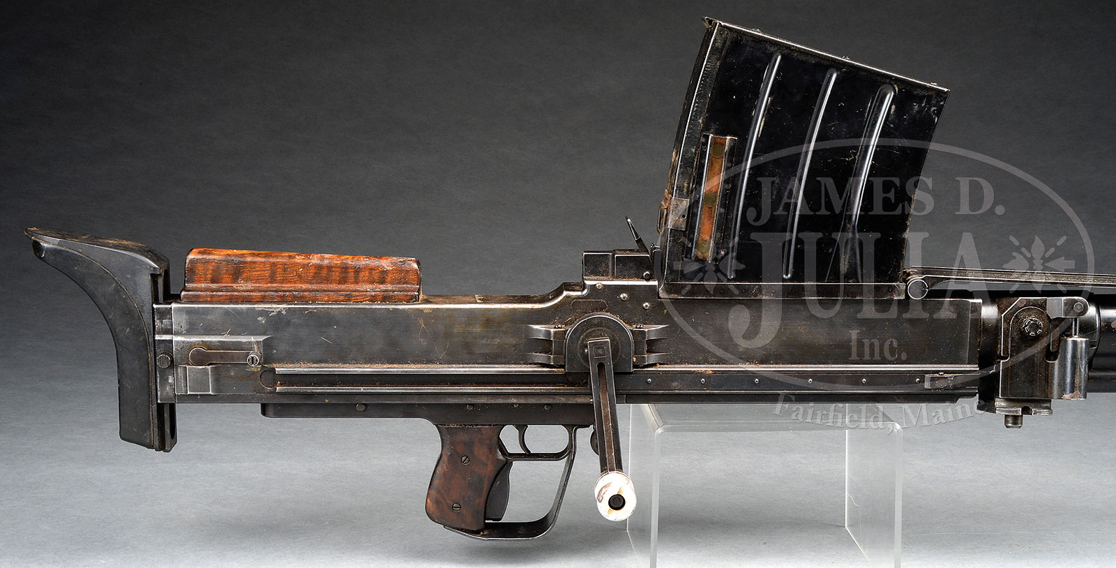 **FINNISH LAHTI 20MM SEMI-AUTOMATIC ANTI-TANK RIFLE (DESTRUCTIVE DEVICE) (C&R).SN 1768. Cal. 20mm. 50″ bbl. Typical “SA” marking on left side receiver with “VKT” manufacturers logo. Non-matching bbl is SN 1785, however, bolt, backplate, handgrip all match receiver SN. Orig shoulder pad un-numbered. Also included is an orig Finnish gunner’s tool box with springs, oiler, and other small parts. Also included are 5 orig mags two of which are in an orig green metal carrying can. Also included are 15 rnds of vintage orig ammunition. No muzzle break present. No skid/bipod assy present. It should be noted that great care should be taken when firing a Lahti to keep hands away from area forward of trigger, as this is where the empty cases impmact with great force when ejected. This is a National Firearms Act item and requires BATF approval for transfer. This item is fully transferable on an ATF form 3 or 4 as Curio & Relic eligible, as a destructive device. CONDITION: Overall appearance very good orig finish turning to a pleasing brown patina with more lustrous blue on bbl and lower assembly. Bolt is very fine, shiny and bright. Wooden cheek piece is fine with a couple chips and handling marks. Wooden shroud is fine with some dings and handling marks. Mechanics are fine. Bore is good with strong rifling turning dark. Gunner’s kit very fine, clean and attractive. Mags and carrier fine and serviceable. Julia’s makes no warrantee on ammunition. Ammunition is somewhat tarnished and with some corrosion, however, the powder moves within the 1941 dated cases. These Lahti 20mm guns are great fun to shoot and this one with its ammunition and tools would make a fine addition to any Destructive Device or WWII collection. 52520-2 JWK (6,500-10,000) C&R – Lot 2169