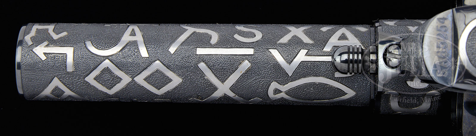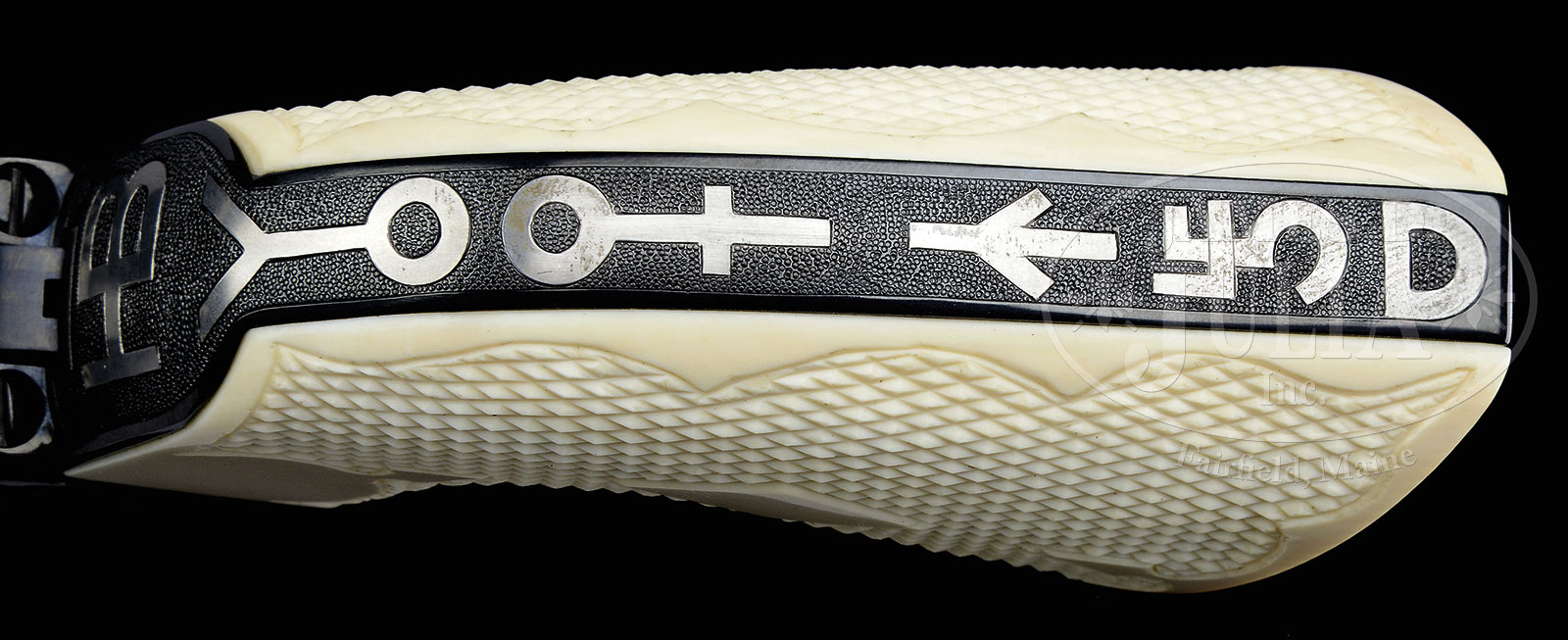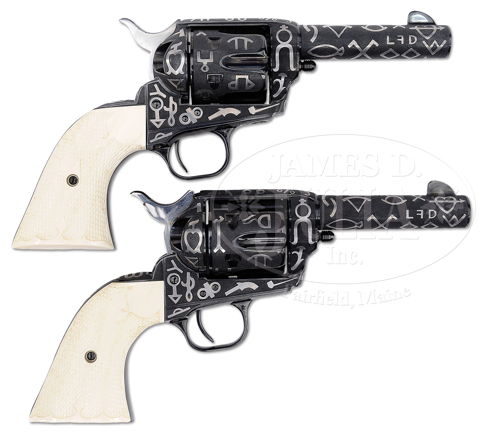 Please Note: Great News! A factory letter accompanies this item. *EXCEPTIONAL CONSECUTIVE NUMBERED PAIR OF COLT STOREKEEPER MODEL SINGLE ACTION ARMY REVOLVERS CATTLE BRAND ENGRAVED AND INLAID WITH SILVER BY COLT MASTER ENGRAVER GEORGE SPRING.SN SA65254/SA65255. Cal. 45 COLT. Revolvers are as nearly as possible precisely identical. They are 3rd generation storekeeper’s model with 2-line address on their 4″ bbls. They have full front sights that have been slightly thinned during the engraving & finishing process. They are full blue finish with 100% coverage, fantastic silver inlaid cattle brands in the tradition of Cole Agee and his successor, Weldon Bledsoe. The entire surrounding surfaces are beautifully pearled except for fine artistic borders and in the flutes of the cylinder. Front straps & trigger plates are likewise not engraved and neither are the hammers. They are mounted with fleur-de-lis & diamond checkered 2-pc ivory grips that are matching numbered to the revolvers. Left side of buttstraps under the grips are engraved “SPRING”, the signature of George Spring, Colt Master Engraver for many years who was at one time in charge of the engraving department. Accompanied by a Colt custom shop oak display case that has gray velvet lining, compartmented in the bottom for both revolvers, with working key. CONDITION: Revolvers are exactly identical in condition. Both appear to be new & unfired, possibly unturned. Grips are equally new with a light ivory patina. Case is equally new. Special Note: This item(s) contains plant or animal properties that may be covered by the Endangered Species Act (ESA). Please read the Conditions of Sale, section 15, for more information regarding the Endangered Species Act, and your responsibilities as a buyer. 52543-1 JRL (15,000-25,000) ESA – Lot 1195