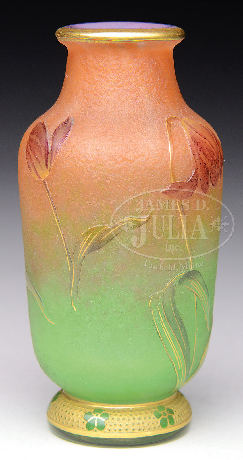 DAUM NANCY CAMEO TULIP VASE.Diminutive Daum vase is decorated with cameo tulip flowers with enameled burgundy blossoms and green leaves having gilded highlights on leaves and stems, all against an acid textured background of bright green shading to orange. Vase is further decorated with gilded top rim and gilded decoration around the foot. Signed on the underside with gilded “Daum Nancy” and Cross of Lorraine. SIZE: 4″ t. PROVENANCE: From an unreserved coastal Maine collection. CONDITION: Very good to excellent with one minuscule burst bubble on the inside of the rim from the making. 52545-6 (800-1,200) – Lot 1004