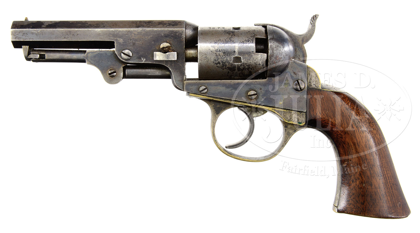 CIVIL WAR ERA J.M. COOPER POCKET PERCUSSION REVOLVER.SN 3075. Cal. 31. Standard 2nd Model with 4″ bbl, 5-shot smooth cylinder, 3-line bbl address. This is a nice example of a popular Civil War era secondary pistol retaining much of its orig finish. CONDITION: Fine overall. Bbl & cylinder retain 20-30% orig finish. Frame retains 60% bright and muted case colors. 2-pc grips retain about 90% varnish with moderate edge wear. Trigger guard & backstrap retain over half their orig tarnished silver plate. Mechanics are functional with crisp rifled bore. 52552-15 JS (800-1,250) – Lot 3216