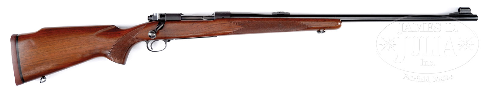*WINCHESTER PRE-64 MODEL 70 BOLT-ACTION RIFLE.SN 383076. Cal. 375 H&H Mag. 25″ bbl with ramp mounted hooded bead front sight. Lyman no. 6 folding rear sight on special base. Bolt and receiver having matching numbers. Monte Carlo walnut stock with hand checkering, sling swivels and original solid red Winchester pad. CONDITION: Very fine. Bbl, action and bottom metal retain 98% orig blue. Stock has very good finish showing light scratches and marks. Mechanics are fine. Bright bore with sharp rifling. 52556-2 DS (3,000-5,000) C&R – Lot 2573