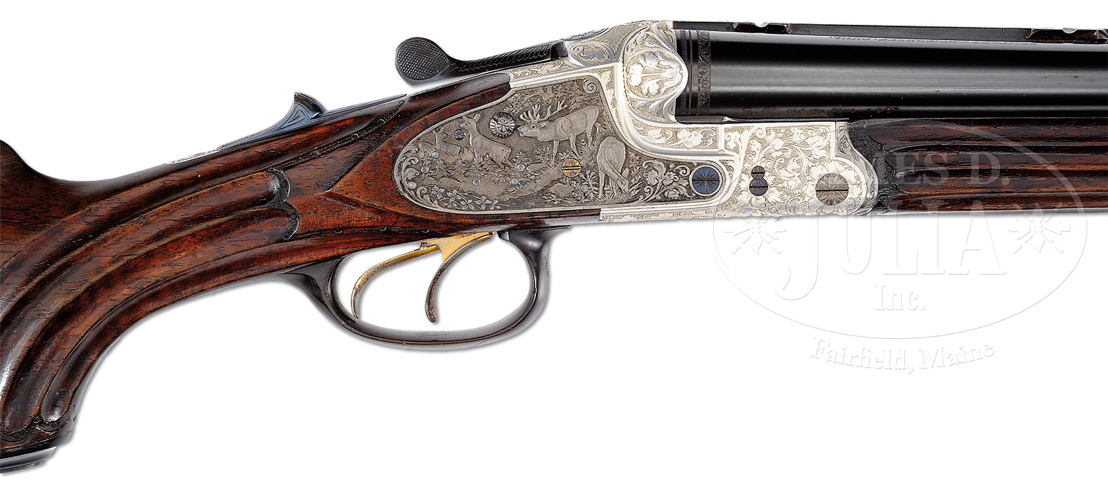 *RARE SEMPERT & KRIEGHOFF “NEPTUN” SIDELOCK FULL STOCK STUTZEN DRILLING WITH DURAL FRAME.SN 17413. Cal. 16 X 16 X 7 x 57R. This very unusual prewar combination gun has 21-3/4″ bbls with raised, matted rib fitted with pop-up rear sight, and Krieghoff style scope bases. Bbls are engraved “Sempert & Krieghoff Suhl.” on tops. Bottoms of bbls are marked with German and Birmingham nitro proofs for 2-3/4″ chambers. Rifle bbl has German and English proofs, and German proof date of 12/ 35. Breech area of rifle bbl is stamped “7 X 57 R”. Dural (aluminum) action features Krieghoff push forward rifle cocking slide on top tang, side clips, Greener crossbolt third fastener, bushed strikers, and gold-plated double triggers (front set). Back action sidelocks with steel plates, have raised rib tumbler end cocking indicators, and safety lever on left side. Action is engraved with near full coverage scrolling acanthus in stippled background. Fences are relief carved in acanthus and floral motif. Bottom of action is engraved “Krieghoff Drilling” and “Neptun Standard” in ribands. Lockplates are deeply relief engraved with well detailed vignettes of game – a bugling stag and 3 hinds in woodland on right plate, and roebuck with doe and 2 fawns in pastoral setting on left plate. Trigger guard is of horn. Nicely fiddle figured, and lightly streaked European walnut full pistol grip buttstock measures 15″ over remnants of pad, and features Bavarian style right hand cheekpiece, steel cartridge trap on toe line, and horn grip cap with engraved steel top that has monogram “JW” inlaid in gold. Instead of checkering, grip has 4 carved flutes on each side, running from grip cap toward lockplates. Borders are stippled. Two piece forend continues the fluted theme with 11 flutes running to slightly schnabeled horn cap at muzzles. Front portion is attached to bbls by the sling loop. Removable portion of forend has Deeley release and horn spacer where it joins front piece of forend. Bore diameter: left -.676, right -.674. Bore restrictions: left -.025, right -.028. Wall thickness: left -.028, right -.032. Drop at heel: Approx 3-1/16″, drop at rear of hogback: 2-5/16″, drop at comb: Approx 1-9/16″. Weight: 7 lbs. 1 oz, LOP 15″. CONDITION: Excellent, as partially refinished. Bbls retain virtually all of high quality British re-black. Action retains virtually all of its silver anodized finish. Lockplates retain nearly all of their French gray, high points pleasingly silvered. Screws and cocking slide are newly temper blued. Stocks retain nearly all of their orig oil finish with grain lifted somewhat, and a number of marks from handling and use. Pad has collapsed, and needs replacing. Action is tight. Bbls are on face. Bores are excellent. A very finely made gun in an unusual configuration and finish, probably one of a kind. 52580-3 MGM (12,500-17,500) C&R – Lot 1721