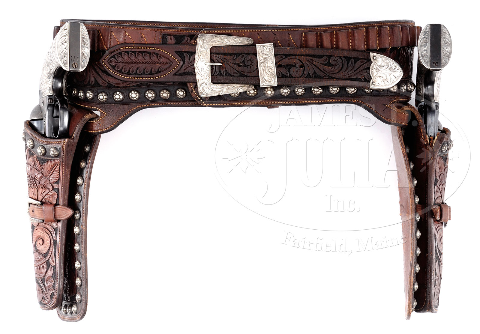 *RARE BRACE OF COLT BISLEY SINGLE ACTION REVOLVERS WITH BOHLIN SILVER GRIPS AND BOHLIN DOUBLE BUSCADERO TOOLED SILVER MOUNTED HOLSTER RIG.SN 309570/262595. 1) Cal. 38 Colt. SN 262595. Blue and color case hardened with 5-1/2″ replacement bbl that has a gold bead altered replacement front sight with 1-line block letter address, marked on left side “(BISLEY MODEL) 38 COLT”. Left side of frame has 2-line three patent dates and Rampant Colt trademark. Backstrap has been fully checkered. Mounted with fantastic engraved hollow Bohlin 2-pc silver grips with screw from right grip. Grips are engraved in incredible foliate arabesque and floral patterns with fine shaded background. Left grip, at the bottom edge is inlaid with the raised gold initials “HMH” (H.M.Horkheimer 1882-1962). Left side of front strap and buttstrap, under the grip is marked with the assembly number “359”, which number is also found inside the ejector housing but not on the bbl or cylinder. This number indicates that this revolver had been returned to Colt for rework, probably at which time the bbl and cylinder were replaced. 2) Cal. 38 Special. SN 309570. Blue and color case hardened with 5-1/2″ bbl that has altered, wedge-shaped front sight pinned over the orig sight. Bbl has 1-line block letter address and left side is marked “(BISLEY MODEL) / COLT SINGLE ACTION ARMY .38 SPECIAL”. Left side of frame has 2-line three patent date and Rampant Colt in circle. This revolver is mounted with nearly identically engraved grips to match number 1 above with the screw from the left grip. Right grip is inlaid with the raised gold initials “HMH”. Revolvers are accompanied by an incredible Bohlin-made dbl Buscadero rig about 44″ l x 3-1/4 w lined dark brown leather belt tooled in foliate and floral arabesque patterns that have fine pearled background. The entire bottom edge of the belt is studded with small silver flower blossom buttons. The billets are mounted with a beautifully engraved Bohlin silver buckle set, marked on back of buckle. The holsters made for 5-1/2″ bbl Single Action revolvers have elliptical Cheyenne plugs with sewn back edge and fine calfskin lining. Holsters are secured to the skirts with a sgl strap that each have a fine engraved Bohlin buckle marked on the back “STERLING”. One of these straps is broken and the other very dry and fragile. Top edge of holsters and completely around the skirts are mounted with matching silver floral buttons. Back of the belt and back of each holster has the “BOHLIN-MADE / CALIF. / HOLLYWOOD” cartouche and back of each holster and belt are professionally hand-carved “H.M.Horkheimer”. Mr. Horkheimer, along with his brother founded the Balboa Amusement Production Company, an early film production company based in Long Beach, California. They began making movies in 1911 and ceased production in 1918 after having produced 229 mostly short films. This is an incredible set by one of Hollywood’s most famous silver and leather companies. The likelihood is that Mr. Horkheimer may have starred in some of his own movies and used this rig with his costume. CONDITION: 1) Fine. Bbl and cylinder retain about 95-96% glossy Colt blue. Frame and hammer retain about 95% orig case colors, strong in front gullets, moderately faded elsewhere. Trigger guard and front strap retain about 95% thinning Colt blue and the backstrap is a blue-grey patina. Grips are extremely fine. Mechanics are crisp. Brilliant shiny bore. 2) Bbl and cylinder retain 95-98% crisp Colt blue with only sharp edge wear. Frame and hammer retain about 30-40% faded case colors with the balance silver-grey. Trigger guard and backstrap retain about 70% orig blue, strong on the trigger guard, faded on the backstrap. Grips are extremely fine. Hammer is not solid in safety or half-cocked notches, otherwise mechanics are fine. Brilliant shiny bore. Holster rig is somewhat dry, in need of treatment with its one broken strap. Otherwise, it is extremely fine with sharp tooling showing little wear or soil. 52587-1 JRL (15,000-25,000) C&R – Lot 1194