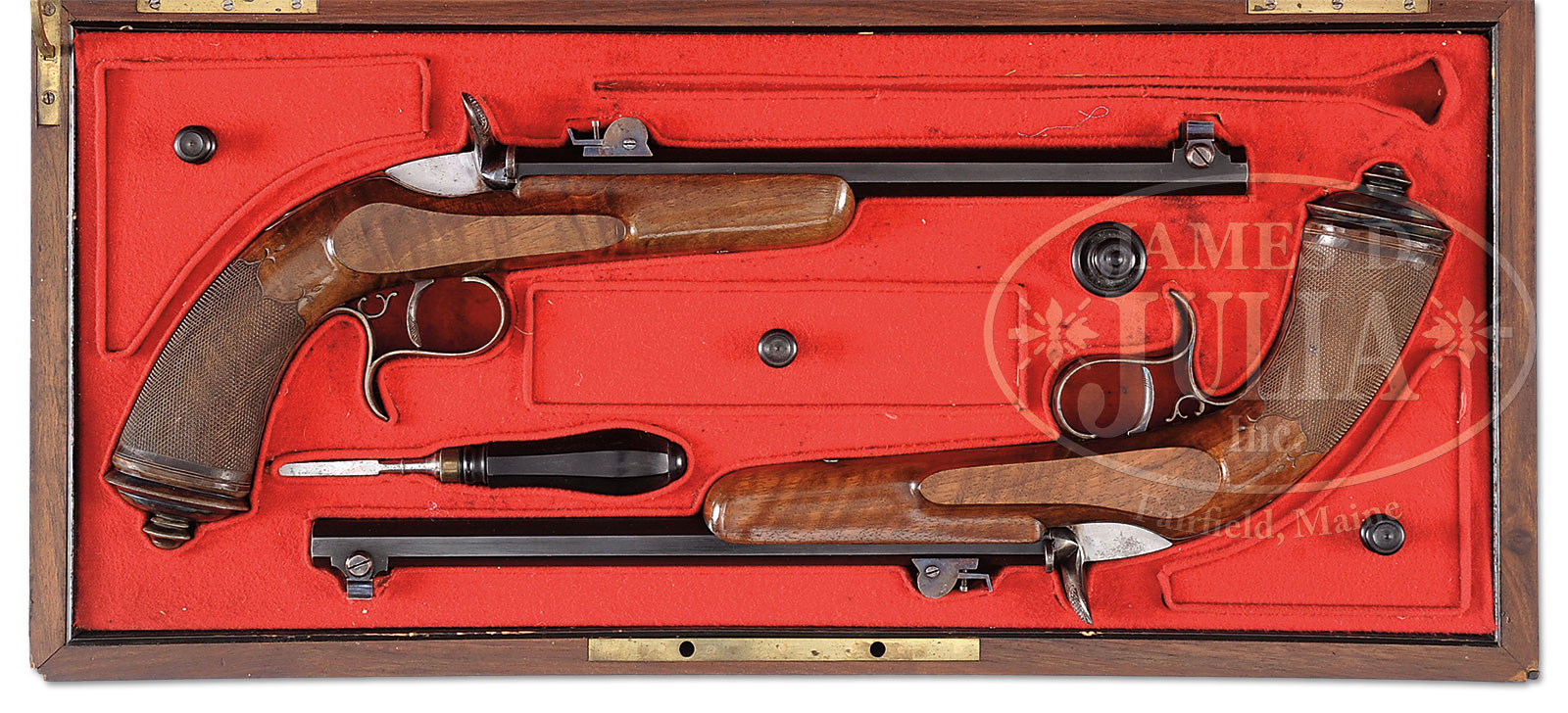CASED HIGH ORIGINAL CONDITION PAIR OF J.H. JAMAR FLOBERT ACTION TARGET PISTOLS.SN NSN/NSN. Cal. 22 BB CAP. 10-1/2″ Blued octagon bbls have adjustable target sights. Flobert type actions with firing pin integral with hammer nose/ breech block are case hardened.Marked J.H. Jamar on underside of barrel, visable when stocks are removed. Half stocks of figured European walnut have nicely checkered flared grips. Iron furniture is color case hardened. Trigger guards have finger spurs. Grips are steel capped. Pistols are housed in fancy walnut veneered case with rosewood trim. Shaped German silver plaque on top is engraved with coat of arms and “A. De Lanefranque”. Case is lined in scarlet cloth and french fitted for guns. Orig accessories include an ebony handled turnscrew and an ebony oil bottle. This magnificent cased pair of pistols were acquired in 1955 from the collection of Charles Porter. This collection was offered August 1955 by the auction house of Robert C. Eldred. PROVENANCE: Consignor states that they were made by J. H. Jamar. CONDITION: Excellent, retaining nearly all orig finishes on wood and metal. Metal has scattered flaking and light rust spots. Wood has some dents and light marks, especially one pistol with ten or so small dents on left side near action. Case is good. Top has some cracks and separation of banding. Renewed interior cloth in lid; orig cloth is fine. 52589-1 (3,500-4,500) – Lot 3399