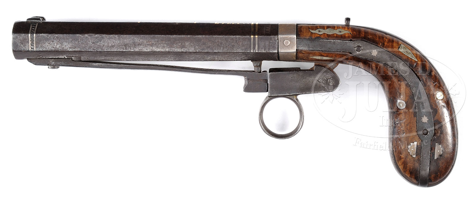UNIQUE CIRCA 1840 UNDERHAMMER PISTOL, PROBABLY SOUTHERN, INSCRIBED TO A PREACHER.NSN. Cal. 36. 10-1/2″ overall with 6″ oct bbl with fixed rear sight on tang and protected German silver blade front sight. Maple grips have central decorated iron band with inset 8-pointed silver stars, the right side terminating in a 1-1/2″ belt hook. 14 other small silver insets are found in wood. This most unusual underhammer has unique mechanism with long spring hammer that is operated by pulling trigger and extension of trigger pulls hammer down and is finally released when extensions length is passed by bar above trigger. Gun is still mechanically functional, quite unique and made by a very resourceful hand. Gilted brass band and braided insets also at breech and center of bbl has silver inset plaque banded by gilt brass, inscribed “REVd KIRKPATRICK”. CONDITION: Good overall. Gun appears all orig and complete. Unique hammer and trigger slightly loose, but as noted, still quite functional. Iron overall is dark grey/patina with staining and light pitting. Stocks are well fit with large hairline crack on right side, slightly shrunk with hand worn patina, all insets intact. This is a unique gun for form which you will probably never see again, especially carried by a preacher. 52594-27 JS (1,500-2,500) – Lot 3284