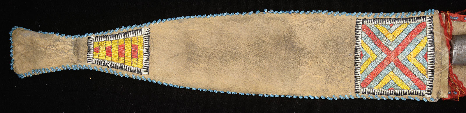 LOT OF NINE 18TH & 19TH CENTURY KNIVES AND BOWIES.1) .This is a very diverse lot of edged weapons including an early, 10-3/4″ (overall) circa 1700 Pique decorated 4-sided flared ivory gripped dagger in brass mounted tin scabbard. Two other early European daggers, including 13″ brass mounted Indo-Persian dagger with spiral carved and pinned polished bone grip with poly-chrome figural decorated scabbard. There is a reproduction Woodhead “California Bowie Knife” 13″ overall with scabbard. CONDITION: Good to very good overall. ESA 2) . Other knives include a Victorian copy of a Medieval dagger, a William Read & Sons marked Bowie with carved ebony grip with leather scabbard, 20″ dbl-edged side knife with massive 14″ blade with reproduction scabbard for display along with two additional knives with scabbards. CONDITION: Good. 3) . The last knife in this lot is an old and interesting skinning knife with 9″ blade, 14-1/2″ overall with “Lady’s Leg” carved grip with pewter ferrule in contemporary quill and beaded Indian-style scabbard with cloth belt. CONDITION: Good to very good overall. Special Note: This item(s) contains plant or animal properties that may be covered by the Endangered Species Act (ESA). Please read the Conditions of Sale, section 15, for more information regarding the Endangered Species Act, and your responsibilities as a buyer. 52594-44, 52594-45, 52594-48 JS (2,000-3,000) – Lot 3431