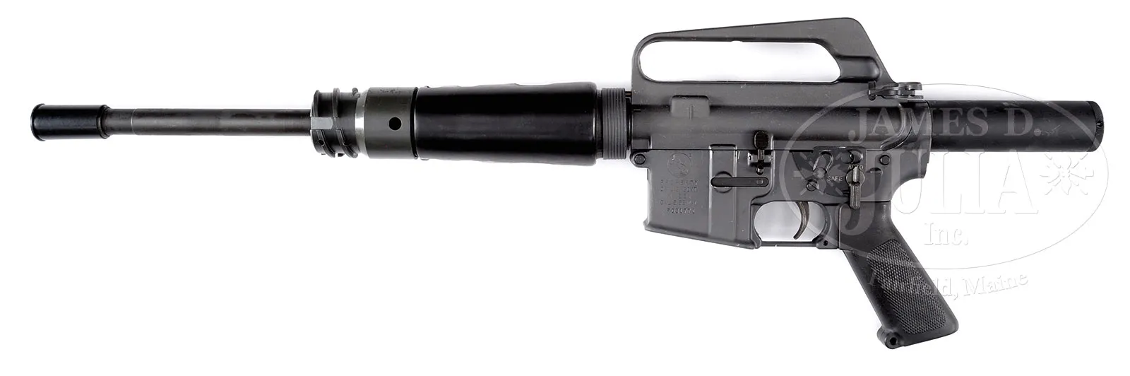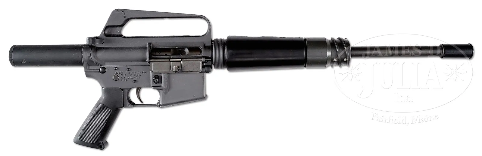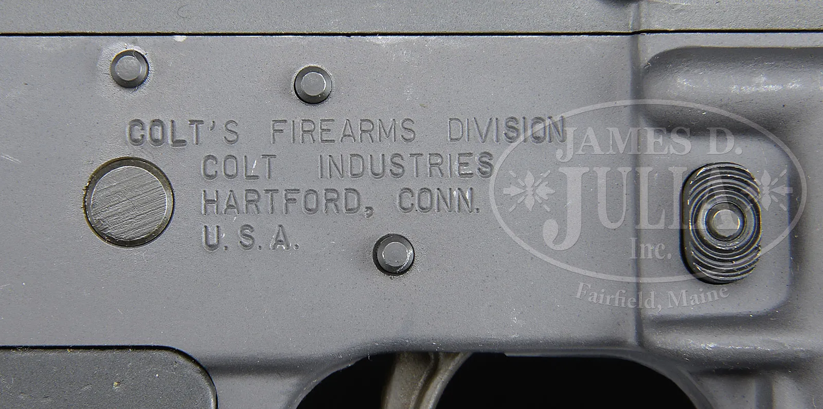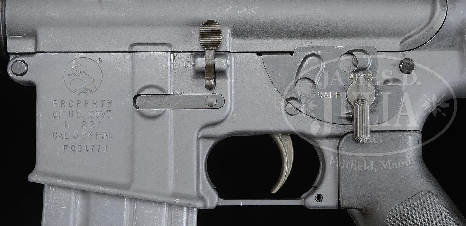 **INCREDIBLY RARE COLT M231 PORT FIRING U.S. PROPERTY MARKED MACHINE GUN (FULLY TRANSFERABLE).SN F031771. Cal. .223. 16″ bbl. Near mint and exceedingly scarce port firing version of the M-16, the M231 is full auto only with no provision for sights, with a threaded boss at the forward edge of the hand guard to be screwed into a vehicular port on the Bradley armored fighting vehicle. The operator would screw this into a port, attach a shoulder attachment with wire and essentially use it to spray would be assailants. Marked with Colt logo and “PROPERTY OF U.S. GOVERNMENT”. This weapon has a unique plate on the left side of the receiver so that the selector will only rotate between safe and auto. No mag present. This is a National Firearms Act item and requires BATF approval for transfer. This item is fully transferable on an ATF form 3 or 4. CONDITION: Overall appearance and finish near mint, extremely fine gray orig finish on all metal parts with hard composite hand guard and hand grip. Mechanics are crisp. Bore is extremely fine, shiny and bright. An exceedingly rare fully transferable variation of the Colt M-16. 52608-1 JWK (29,000-40,000) – Lot 2086