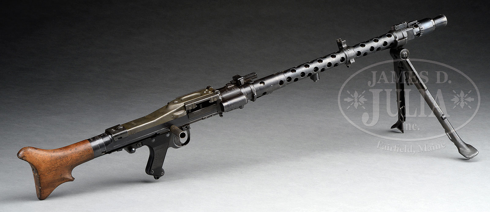 **OUTSTANDING NEAR MATCHING MAUSER MFG GERMAN MG-34 MACHINE GUN (C & R).SN 8579B. Cal. 8mm. 24″ bbl. Beautiful orig MG-34 with receiver buffer, stock and hardware, as well as shroud all matching. Bbl is unnumbered post war Israeli chrome lined. Bi-pod is Nazi proofed, unnumbered. Top cover NO. 8722. Feed tray NO. 8658B. Receiver marked WaA 26, indicating Mauser MFG, with many other parts marked as mfg by Mauser, as is shroud which is marked S/243 and dated 1940. Includes two additional Israeli bbls, and 3 assault drum carriers with a total of six 50 rnd assault drums, with 4 belt segments. This is a National Firearms Act item and requires BATF approval for transfer. This item is fully transferable on an ATF form 3 or 4 as Curio & Relic eligible. CONDITION: Overall appearance and finish is extremely fine as refinished with a lustrous blue on all except top cover and feed tray which retain more of a gray/green finish. Faithful quality refinish difficult to discern from orig with some tiny areas of pin prick oxidation visible on close examination on underside of shroud with “ghost” of last 2 digits of SN in electropencil on a couple of small parts, such as shroud retention latch. Buffer has not been refinished. Wooden butt has a 2-3/4″ crack on left side parallel to bore line which would be a straight forward repair. Spare bbls extremely fine with bright bores. Drums and carriers very fine with over 95% dark green paint coverage with some scattered areas of corrosion. Mechanics are crisp. Bore is very fine, bright and brilliant. MG-34s seldom are found as matching as this one. This particular specimens action is very smooth and with it’s spares will make a fine addition to any WWII collection. 52619-67 JWK (18,000-25,000) C&R – Lot 2101