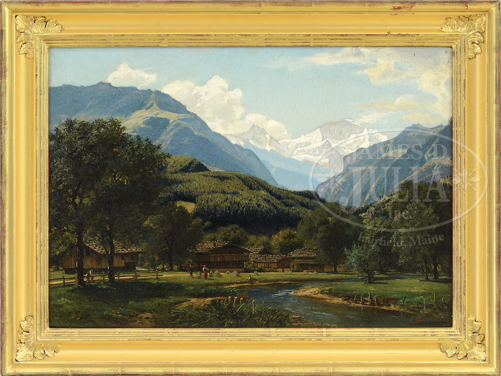F. PAULI (European, 19th/20th century) ALPINE VILLAGE WITH STREAM AND MOUNTAINSOil on canvas