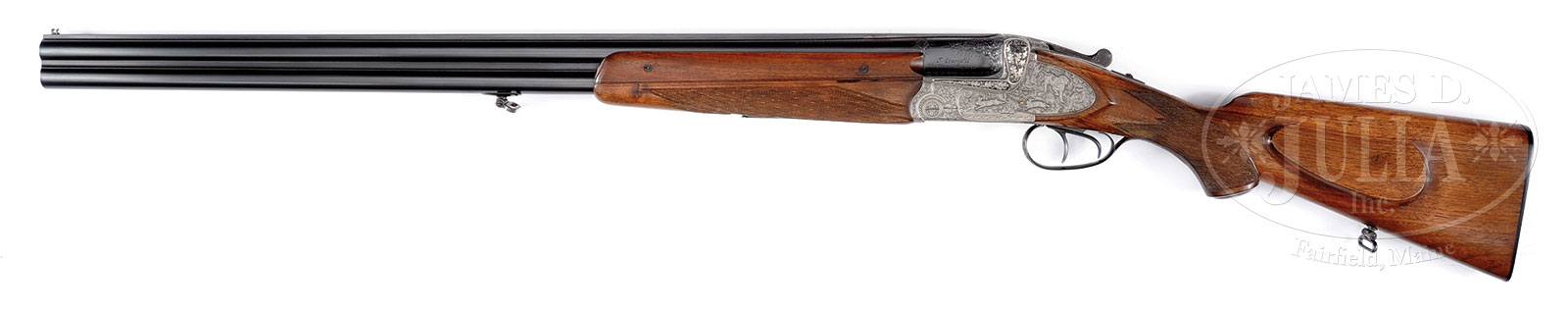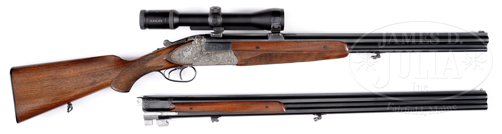 *FINELY ENGRAVED BSW (SIMSON) OVER-UNDER EJECTOR RIFLE/ SHOTGUN WITH DOUBLE SHOTGUN BARRELS AND KAHLES SCOPE, RETAILED BY STAMPFLI OF LUZERN, WITH CASE.SN 54921. Cal. 12 ga/ 8x57R. 24-1/2″ Rifle/ shotgun bbls with full length rib fitted with folding rear sight and claw bases are marked with Stampfli name and address on top bbl. 29-1/2″ OU shotgun bbls with full length matted rib, are marked “SIMSON SUHL” on rib, and with Stampfli markings on left of mono-bloc. Coin finished sideplated double Kersten Blitz action with non-automatic tang safety and double triggers (front set), is finely engraved with very well cut open shaded scroll surrounding vignettes of game; alert roebuck on bottom of action, left lockplate portrays pointer retrieving bird while a pair of rabbits scamper off in foreground. Right lock depicts a fox with grouse in mouth as three of its cohorts flush in foreground. Fences and reinforcing bolsters are deep relief carved with exceptionally well rendered oak leaves. Relatively plain European walnut capped pistol grip buttstock measures 14-1/4″ over composition Simson buttplate. Stock features skip line checkering and right hand cheekpiece. Matching bottom portion of 3-pc ejector forend with Deeley release services both bbl sets. Kahles Helia C 1.5 – 6 X rail scope with 30 mm tube and crosshair and three point reticle is in claw rings. Rifle/ Shotgun BBls: Bore diameter: top -.731. Bore restrictions: top – .037 (extra full). OU Rifle shotgun bbls :Bore diameter: top -.724, bottom – .724. Bore restrictions: top – .040 (extra full), bottom – .030 (full). Wall thickness: top – .035, bottom – .036. Drop at heel: 2-13/16″, drop at comb: 1-3/4″. Cast about 1/4″ off. Weight: 6 lbs. 12 oz. LOP: 14-1/4″. Green vinyl case with tan leather trim is lined in green velvet. CONDITION: Excellent, close to new, with only a few light handling marks in all finishes. Bores are excellent. Mechanically excellent. Scope is near new, optically clear. Case is excellent. An attractive useful combo. 52625-20 MGM (4,000-6,000) C&R – Lot 2651