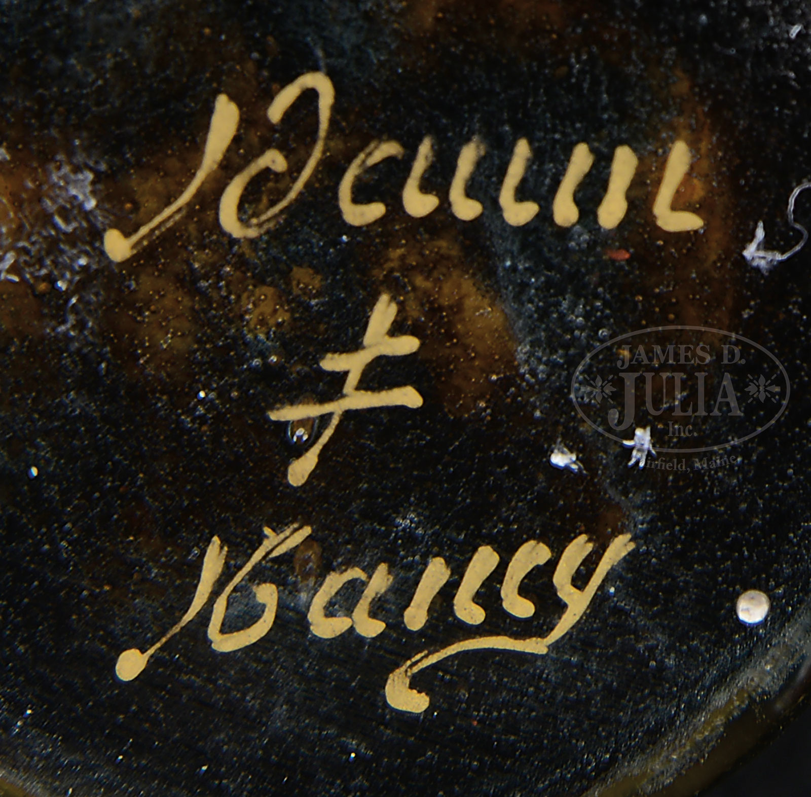 DAUM CAMEO AND ENAMELED MINI VASE.Daum mini vase is decorated with cameo flowers, stems, and leaves. The leaves and stems are enameled in shades of green while the flowers are enameled in shades of red all against a mottled brown shading to orange shading to yellow background. Signed on the underside with gilded signature “Daum Nancy” with the Cross of Lorraine. SIZE: 5″ t. CONDITION: Very good to excellent. 52628-11 (2,750-3,250) – Lot 1022