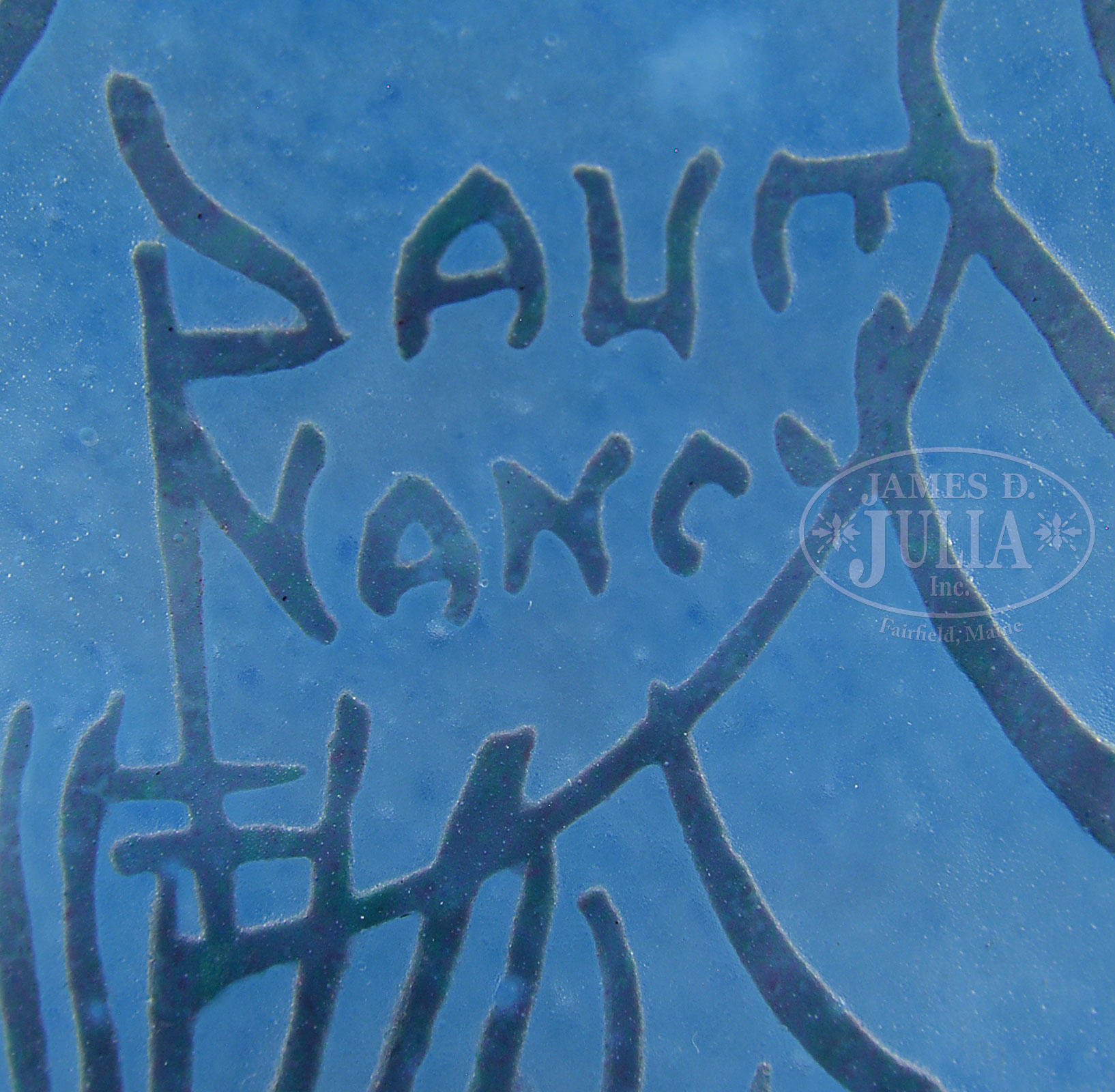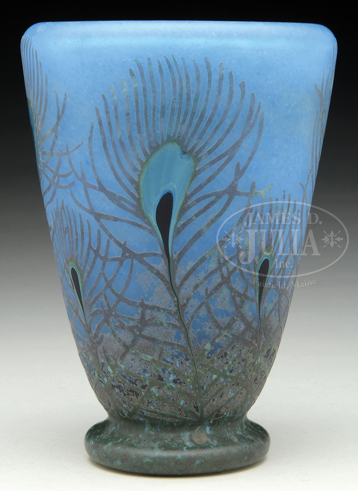 DAUM CAMEO GLASS PEACOCK VASE.Daum cameo glass vase is decorated with a peacock feather design with green and brown feathers each having a black peacock eye center surrounded by light blue. The peacock feathers are set against a mottled blue background and the vase is signed on the side in cameo “Daum Nancy” with the Cross of Lorraine. SIZE: 6-3/4″ t. CONDITION: Very good to excellent. 52628-15 (6,000-7,500) – Lot 1034
