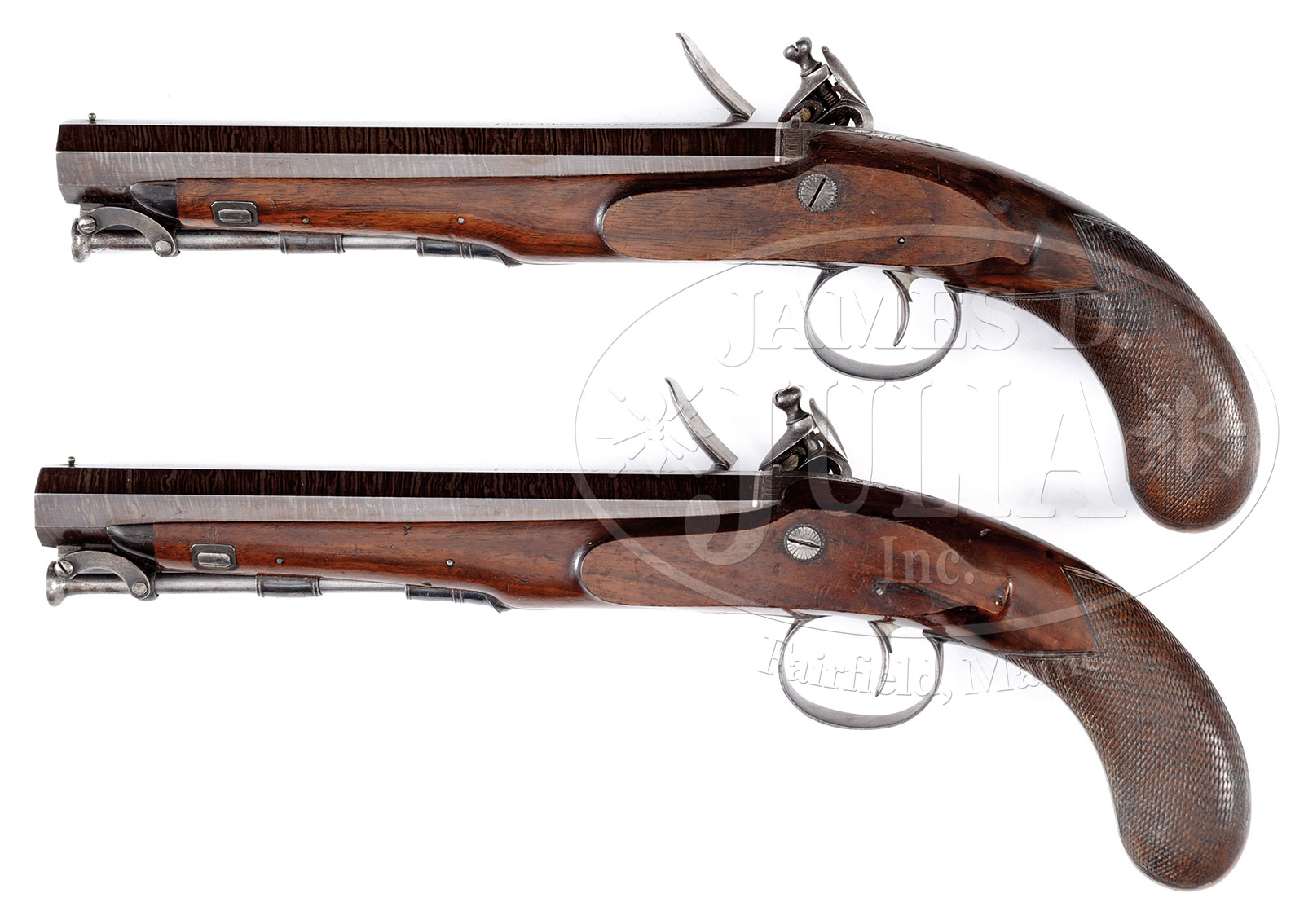 FINE QUALITY PAIR OF LARGE BORE FLINTLOCK HOLSTER PISTOLS BY ILSLEY OF LONDON WITH DUBLIN CONSTABULARY REGISTRATION NUMBERS.NSN. Cal. .625. 8-1/2″ Octagon twist bbls with platinum lines at breech ends and captive bridled steel ramrods, are engraved “Ilsley London” (dates unknown) on top flats. Flats are also marked with Dublin Constabulary Registry numbers “DC-3900” and “DC-3901”. London black powder proofs are on bottom flats. Foliate engraved breech irons have integral rear sights. Chamfered locks with rebated squared tails have waterproof pans with bridled roller frizzens, as well as high breasted serpentine cocks and back sliding safeties. Plates are engraved with traditional foliate scroll and sunbursts. “Ilsley” is under pans. European walnut stocks with checkered bag grips extend to within 3/4″ of muzzles and have horn tips. Iron mounts include nicely filed ramrod pipes and trigger guards with stylized pineapple finials. Vacant rectangular silver crest plates are at tops of grips. CONDITION: Fine, as partially refinished. Bbls are nicely re-browned with excellent definition to pattern. Locks have traces of orig color where protected, are mostly gray to brown. Traces of orig temper blue are on frizzen springs. Stocks have most of their orig finish. Iron furniture has a considerable amount of orig bright blue. Bores are fine, lightly pitted. Mechanically fine. No noted replaced parts. One lock is a bit weak. 52630-4 MGM (7,500-10,000) – Lot 1543