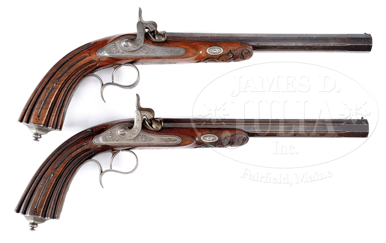 PAIR OF FINE TARGET PISTOLS BY MOUTIER LEPAGE.NSN. Cal. .47. 10-1/2″ Fluted octagon bbls are engraved “Fni P. Lepage Moutier a Paris” on top flats. Pistols are numbered “1” and “2” on tops of engraved breech plugs and irons. Island type shaped bar locks have tall robust hammers and are nicely scroll engraved. This engraving extends to other iron furniture including spurred trigger guards and heavy grip caps. European walnut flared and fluted grip half stocks have heavy relief carving at tips with no provision for ramrods. CONDITION: Fine, with most of their orig finish on all surfaces, but show considerable wear, marks, and general use. Mechanically good. 52632-1 MGM (3,000-4,000) – Lot 3397