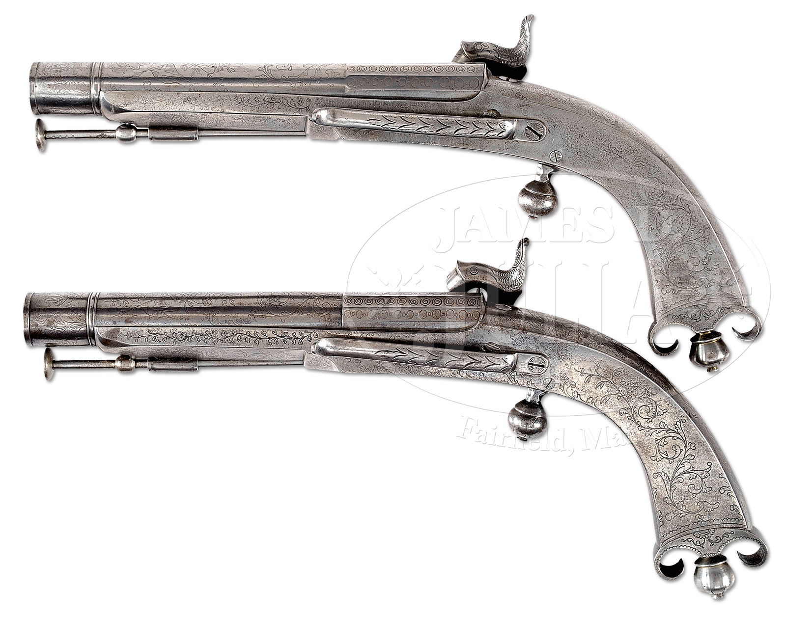 HIGH QUALITY UNMARKED PAIR OF SCOTTISH PERCUSSION ALL METAL BELT PISTOLS.NSN. Cal. 52. 6-1/4″ Octagon to round bbls, 11″ overall. Bar type locks. All metal construction with rams horn butts and ball triggers. Belt hooks are on left sides. All surfaces are engraved with lightly cut scroll. Scottish themed stands-of-arms are on tops of grips, and right sides of butts. CONDITION: Good. All surfaces cleaned to pewter gray over scattered light pitting. Mechanically good. 52632-2 MGM (4,000-6,000) – Lot 3392