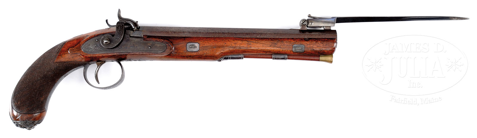 JACKSON ENGLISH PERCUSSION KNIFE PISTOL.NSN. Cal. about 59. 10-1/4″ Damascus oct bbl. Top flat is marked “MARKET HARBORO”. Bbl is fitted with spring loading folding knife with 7″ triangular blade. Thumb operated sliding release is located on top tang. Lock is marked “JACKSON”. Lock hammer, top tang and trigger guard have floral engraving and fancy borders. Plain trigger. Key fastened walnut stock with checkered wrist and lion’s head buttcap. Trigger guard, pineapple finial plate, faceted thimble and sgl pipe are iron. German silver fittings include four key escutcheons and rectangular wrist plate. Brass tipped hardwood ramrod. CONDITION: Fine. Bbl retains 90% lightly faded brown finish showing small spots of corrosion. Knife blade has good fire blue color. Lockplate has fading case color finish. Trigger guard and other iron fittings retain 70% blue. Sound stock with orig finish shows numerous dents, dings, scratches and handling marks. Mechanics are fine. Bore shows some light pitting. 52632-20 DS (5,000-7,000) – Lot 3384