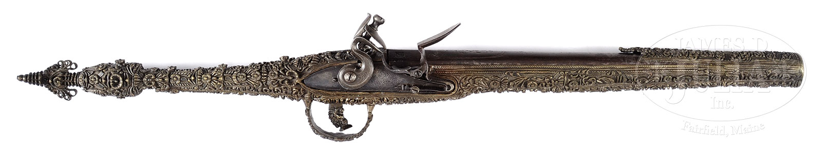 19TH CENTURY ALBANIAN METAL STOCKED FLINTLOCK PISTOL.SN NA. Cal. 28 bore. 23-1/4″ overall. 12-1/4″ bbl with light engraving and makers cartouches at breech. Unique long tailed Albanian-style relief cast silver plated metal stock is not often seen. CONDITION: Very good overall. Gun appears orig and complete with addition of restored screws and cock. Steel has a plum/gray patina with pitting. Stock has a overall dark gray/brass patina. Mechanically functional with smooth pitted bore. 52632-24 JS (1,200-1,500) – Lot 3406