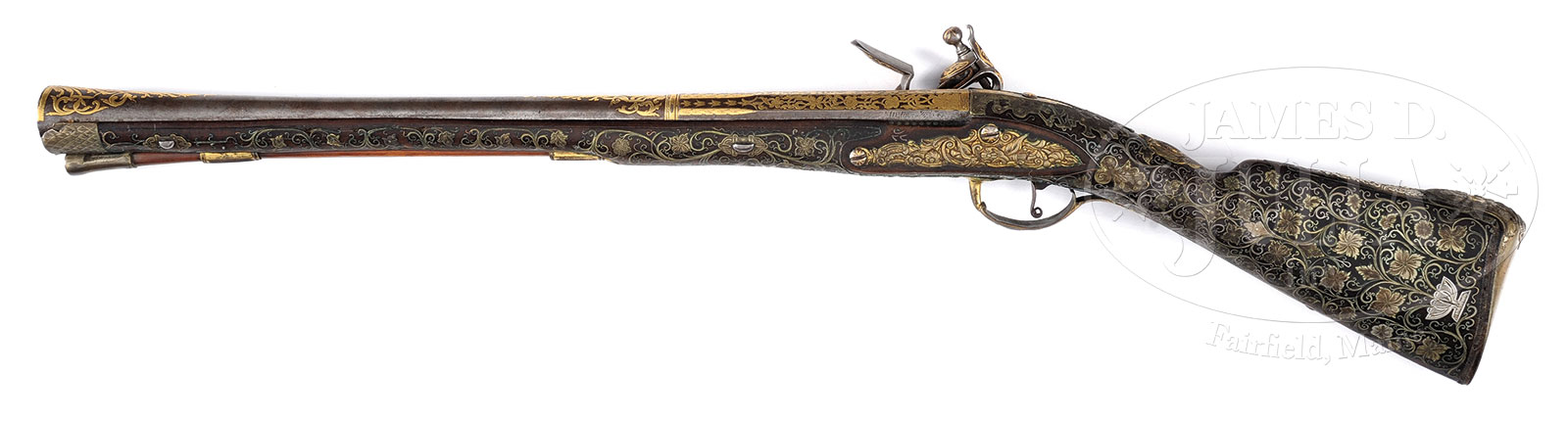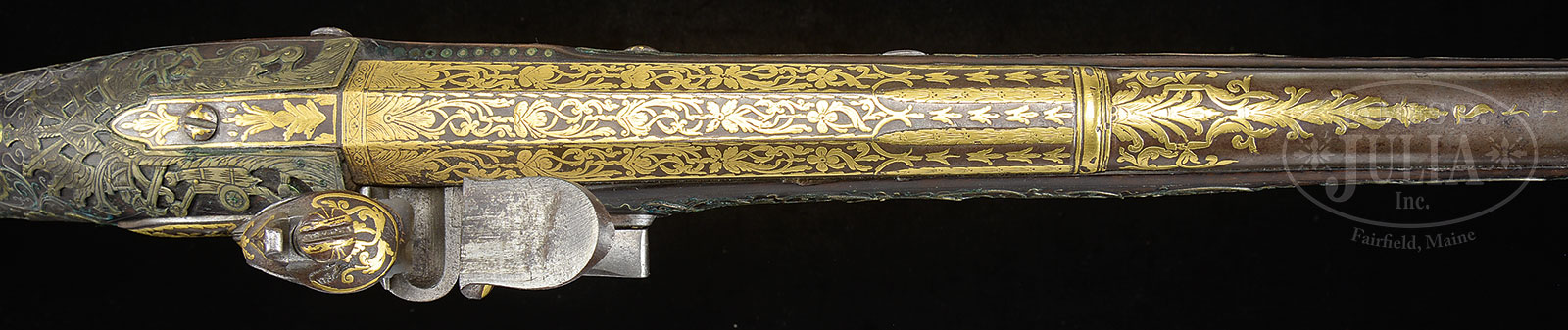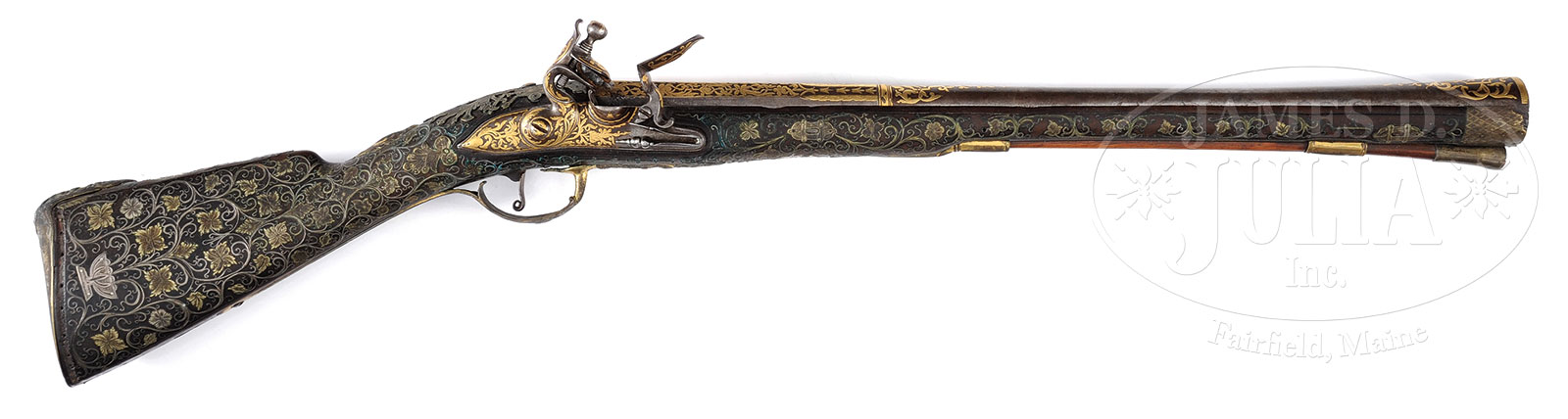 FINE AND RARE OTTOMAN GOLD AND SILVER MOUNTED BLUNDERBUSS CIRCA 1800 MADE FOR OTTOMAN PALACE GUARDS.NSN. Cal. 1.25. This beautiful and elegant blunderbuss is from a known series of similar arms thought to have been made for Ottoman palace guards. 30″ overall with 19-1/4″ swamped bbl flaring to 1-1/4″ at muzzle. About 60% of surface of bbl is inlaid with gold arabesques as is lock, cock and battery. Stock is profusely inset with silver wire and gilted brass & silver insets over most of its length as seen in photos. The brass mounts are relief cast with gilt. CONDITION: Very good to fine overall. Steel is an overall gray patina with virtually all of gold insets intact. Insets and stock are 98% intact with discernible loss of two narrow 4″ silver strips framing buttplate. Top of buttplate comb has 2-1/2″ contemporary silver arabesque which is not en suite with the rest of decoration. Stock is sound with one small noticeable hairline and a few small reductions. Mechanics are fine with smooth pitted bore. 52632-28 JS (5,000-7,000) – Lot 3400