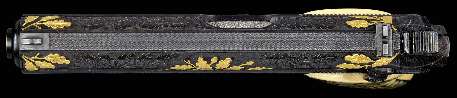 *FANTASTIC EXHIBITION ENGRAVED AND GOLD-INLAID CASED WALTHER PP PISTOL WITH CASE AND TWO MAGAZINES.SN 755507. Cal. 7.65. Standard configuration. Early pre-war production with 90 degree safety and crown over “N” proofs. Nearly full coverage of very fine oak leaf and acorn pattern engraving with gold inlaid oak leaves and acorns at muzzle, mid point, and top rear of slide; also on left side of frame under magazine release, and on front and rear grip straps. SN is gold inlaid on right. Pistol is fitted with ivory grips, nicely engraved and scrimmed in oak leaves and acorns. Supplied are two magazines, one with extended ivory base plug matching grips; the other with large steel base engraved to match remainder of pistol. Pistol is housed in a brown leather French fitted case with forest green velvet lining. CONDITION: Very fine, retaining essentially all of its blued finish. Grips are very fine except for some slight checks at top of left grip below safety. Base plug of extended magazine shows some repairs with slight material loss. Bore is very fine, bright and shiny throughout. Mechanics are fine. Box shows some slight interior wear at edges of fitted mortise. An outstanding example and would be very difficult to improve upon. 52634-4 TDW (7,500-12,500) C&R – Lot 2021