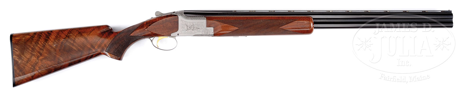*BROWNING SUPERPOSED PIGEON GRADE FIELD SHOTGUN WITH CASE AND FACTORY LETTER.SN 18647S73. Cal. 12 ga. 26-3/8″ Bbls marked for modified and full chokes, are fitted with matted ventilated rib. Coin finished action is engraved in typical “pigeon” style with pigeons flying through a field of simple scroll on sides. Semi-relief rose bouquets are on bottom. Very well carved oak leaves and acorns are on top. (No signature found.) Long tang square knob nicely figured claro walnut buttstock measures 14-3/8″ over Browning buttplate. Slim forend matches well, but is not figured. Chokes appear to be unaltered. Drop at heel: 2-5/16″, drop at comb: 1-7/16″. Weight: 7 lbs. 3 oz. LOP: 14-3/8″. Tan Hartmann case is lined in faux fur and contains two keys. PROVENANCE: Factory letter. CONDITION: Excellent, very close to new, appears essentially unfired, with no discernible halos on breechface, with a few light handling marks. Mechanically crisp. Case is excellent. A very attractive pigeon grade. 52641-3 MGM (4,500-5,500) – Lot 2624