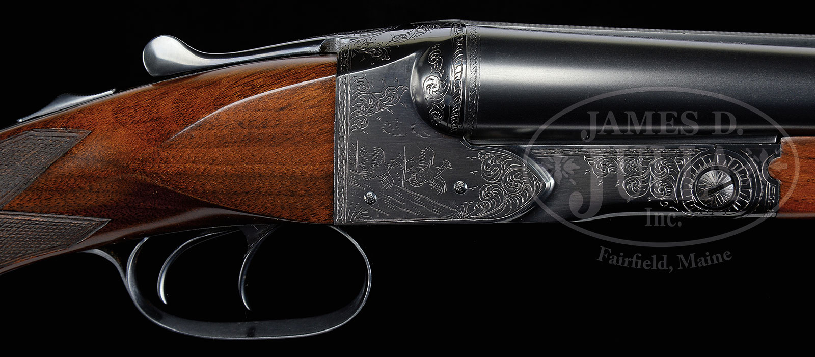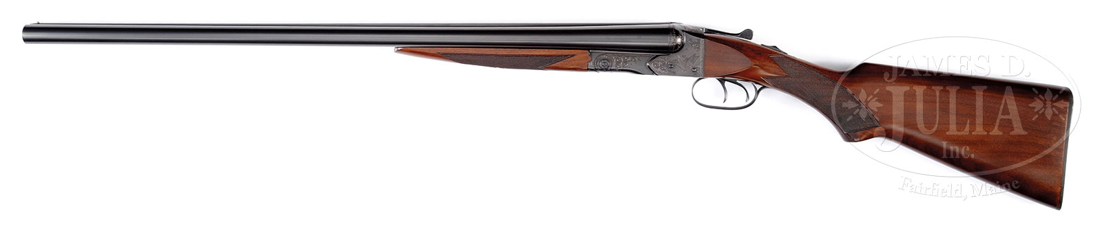 *EARLY WINCHESTER MODEL 21 SHOTGUN FACTORY REFURBISHED AND ENGRAVED BY NICK KUSMIT IN 21-4 STYLE WITH SUPPORTING LETTERS.SN 1761. Cal. 12 ga. 26″ Bbls marked for Cyl and Mod have Winchester nomenclature on tops. Early standard action with double triggers and automatic safety has been engraved by master Winchester factory engraver, Nick Kusmit, in “21-4” style with sprays of simple scroll surrounding hunting scenes; pair of rising ducks on left, and pair of grouse flying into opening from woodland on right. A pointer and setter (pointing) are on trigger plate. Engravers initials “NK” are under duck scene. Plain American walnut pistol grip stock with long grip measures 14″ over composition Winchester buttplate. Matching splinter forend has early knobbed secondary latch. Bore diameter: left -.729, right – .729. Bore restrictions: left – .012 (lt mod), right – .002 (cyl). Wall thickness: left – .038, right – .035. Drop at heel: 2-9/16″, drop at comb: 1-9/16″. Weight: 6 lbs. 15 oz. LOP: 14″. PROVENANCE: Supporting letters from Ed Ulrich regarding factory work done at his request, and stating that he had Nick Kusmit engrave it. Letter, from Nick Kusmit, stating that he engraved this gun in 21-4 pattern. Cody letter stating no records are available. CONDITION: Excellent, as completely factory refurbished, retaining nearly all finishes on wood and metal over some marks, with a few subsequent handling marks and dings. Bores are excellent. Mechanically fine. 52655-3 MGM (5,000-8,000) C&R – Lot 1516 Click here to view provenance
