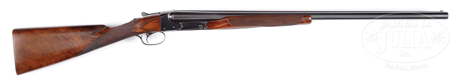 *28″ BARRELED WINCHESTER MODEL 21 SKEET SHOTGUN.SN 12208. Cal. 12 ga. 28″ Bbls choked Skeet 1 and 2. Standard blued action is marked “SKEET” on trigger plate and has blued single selective trigger. Lightly figured American walnut straight grip stock measures 14″ over checkered wood butt. Unbraced long beavertail ejector forend matches well. Bore diameter: left -.728, right – .728. Bore restrictions: left – .010 (skeet), right – .008 (skeet). Wall thickness: left – .038, right – .034. Drop at heel: 1-7/8″, drop at comb: 1-7/16″. Weight: 7 lbs. 11 oz. LOP: 14″. CONDITION: Fine, as refinished, with nearly all factory type finishes on wood and metal over a few light marks, with some subsequent silvering and marks on wood. Bores are fine, lightly frosted. Action is a bit loose. Bbls are slightly off face. Ejectors and trigger are fine. 52656-4 MGM (4,000-6,000) C&R – Lot 2550