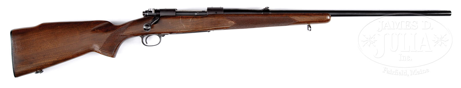 *WINCHESTER MODEL 70 PRE-64 BOLT ACTION RIFLE.SN 554880. Cal. 270 WIN. Standard weight rifle with 24″ bbl. Front sight is removed. Folding leaf rear sight. Bolt and receiver have matching SN’s. Walnut Monte Carlo stock with hand checkering sling swivels and plastic buttplate. Includes bolt tag, hang tag and sight alignment tag. CONDITION: Very good. Bbl and action retain over 95% blue with visible solder from front sight removal. Orig stock finish shows scratches and handling marks. Mechanics are fine. Nice bright bore. 52672-1 DS (800-1,200) C&R – Lot 2581