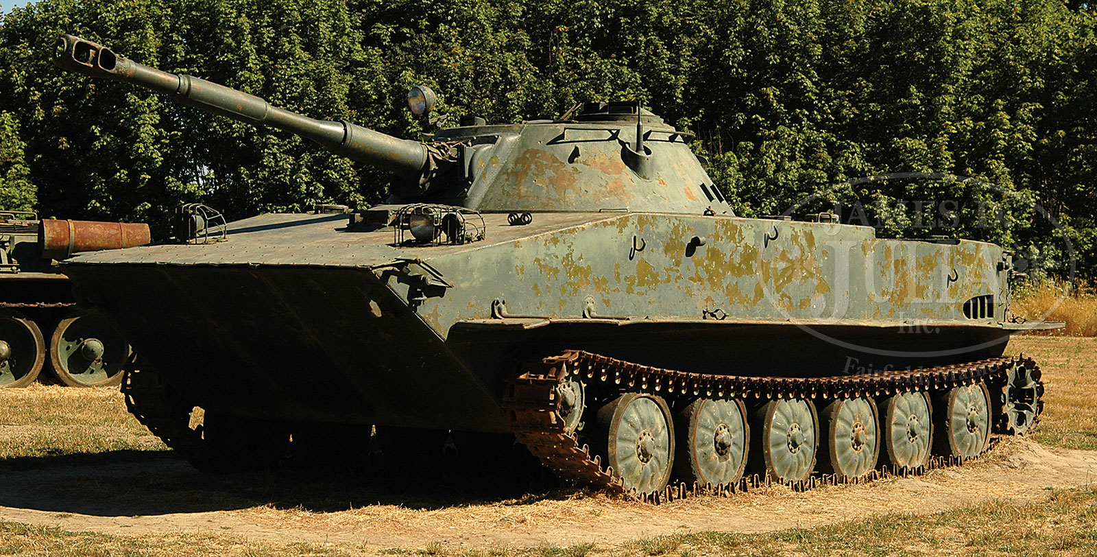 VERY RARE REVOLUTIONARY SOVIET PT-76 AMPHIBIOUS TANK.The PT-76 is a revolutionary Soviet light tank first fielded in the mid-1950’s. It was exported to many countries and was one of the only armored vehicles the United States ground forces in Vietnam ever came in contact with. It was primarily used in the reconnaissance role due to its light armor and its ability to ford bodies of water. It was designed as a fully amphibious tank that was propelled in the water by its innovative water jets system. The water jets system gave the tank a speed in the water of 6 mph and increased maneuverability and control than conventional amphibious vehicles. The PT-76 is conventional in its layout with a driver in the front center of the hull and the commander and gunner in the turret with the engine in the rear. The driver’s seat is centered in a very open compartment and has controls of both the land and water drive systems. He can start the engine with either an electric or air start from his position. He has control of bilge pumps, pre heater and a smoke screen from his main control panel. He can manually erect a trim vane at the front of the vehicle to help stop waves from going over the bow while in rough water. In the turret the commander and gunner have control of the D-56TM 76.2mm main gun and a 7.62mm coax SGMT machine gun. The radio is located in the turret as well along with everything needed to operate the gun system. The engine is a model V-6 straight 6 cylinder, water cooled diesel mated by a manual clutch to a 5 speed transmission. The engine was basically the T-34 motor cut in half and it produced 240 hp at 1800 rpm. It weighs 15 tons, is 23′ long, 10′ wide and 8′ in height. Note: This vehicle is displayed off site. Please contact our office for viewing information. CONDITION: This is a very rare vehicle in this good a condition. It does show some weathering due to being stored outside. It has not been run for 8 years but would take very little to get it going again. The interior is very complete and includes, spare track links, periscopes, a demiled SGMT coax machine gun and radio. The engine and transmission are clean and turn over freely. This is a rare opportunity to acquire one of the most sought after of the post war Soviet vehicles. 52675-1 MS (45,000-90,000) – Lot 2062