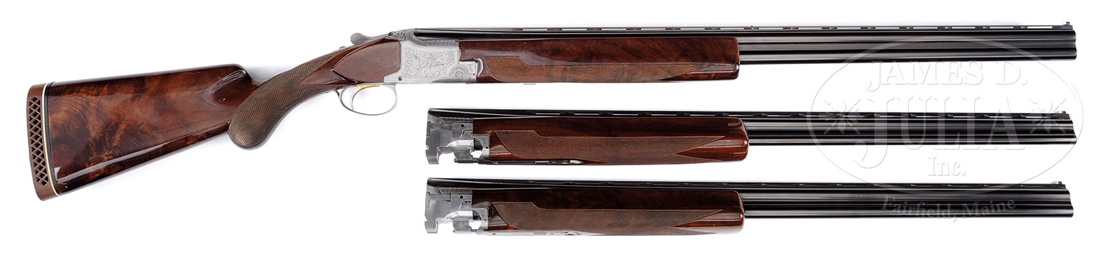 *BROWNING SUPERPOSED PIGEON GRADE SMALL GAUGE THREE BARREL SKEET SET SHOTGUN WITH CASE.SN 59640V70. Cal. 20/ 28/ ,410. 28″ Bbls with narrow matted ventilated ribs have St. Louis and Montreal markings on left sides, and are all marked for “skeet” and “skeet”. Coin finished OU action with gold plated single selective trigger is engraved with pigeons flying through field of scroll on sides, and with rose bouquets on bottom. Fences are relief carved with oak leaves. Stump figured American walnut short tang round knob buttstock measures 14-1/8″ over brown Browning pad. Each bbl set has its own matching flared target forend. 20 ga. Bbls: Drop at heel: 2-3/8″, drop at comb: 1-1/2″. Weight: 7 lbs. 0 oz. LOP: 14-1/8″. Tan Hartmann case is lined in faux fur, and contains keys and extra bbl weights. CONDITION: Excellent, showing relatively light use, browning and rubbing of coin finish on action, with a considerable number of light marks, rubs and scratches in gloss finish of wood. Mechanically fine. Case is fine. Interior soiled. 52676-3 MGM (8,000-12,000) – Lot 1679