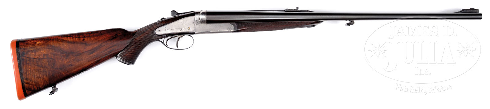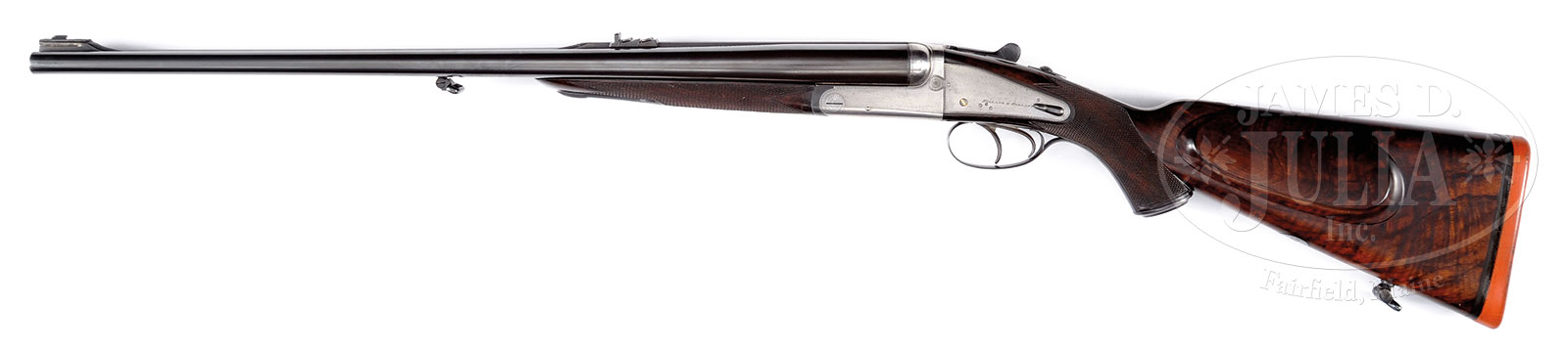 *HOLLAND & HOLLAND NUMBER 2 (DOMINION) DANGEROUS GAME DOUBLE RIFLE, THE IDEAL “WORKING” RIFLE.SN 19496. (ca 1911) Cal. .500/ .465 Nitro. 24″ Chopper lump bbls engraved “Holland & Holland 13 Bruton Street, London” on tops are fitted with matted quarter rib, and matching front ramp base holding one standing, two folding leaf express rear sight and silver bead front. Intermediate rib is engraved “.465”. Bbl flats are stamped with London nitro proofs for .465 and 14 tons (no load data given). Bottoms of bbls are stamped with SN which is also on loop. Splinter is stamped “A. Smith”. Sling loop is soldered to bottom rib. Coin finished action with hand detachable back locks features non-automatic safety (SAFE inlaid in gold), long top tang which extends over comb, pivoting third fastener, bushed strikers, gold band tumbler end cocking indicators, and dbl triggers. Action is engraved with small scroll borders. “Holland & Holland” is on each lockplate. Bottom of action is engraved with caliber and charge. Exceptional for grade, finely marbled and exceptionally well stump figured European walnut steel trap capped pistol grip buttstock measures 14-1/2″ over Silver type pad. Stock features classic H&H styling with point pattern checkering at grip, which has reverse curve to back line, and classic shadow line cheekpiece. Silver oval on toe line is engraved “A. W. G.” Matching splinter forend has forward pivoting release as often found on large caliber double rifles. Drop at heel: approx 3″, drop at comb: approx 1-15/16″. Neutral cast. Weight: 10 lbs. 12 oz. LOP: 14-1/2″. CONDITION: Very good to fine, as refurbished. What are most likely new factory replacement bbls retain nearly all of their orig blue. Action cleaned to coin finish over some scattered light pitting, with some fairly deep pits on top tang behind safety. Stocks are nicely refinished, wood a touch below metal, especially on top tang. Checkering competently re-cut. Bores are excellent, essentially as new. Action is tight. Bbls are on face. This rifle is an excellent choice for your next safari. Consignor states that this rifle shoots exceptional well with modern Kynoch ammunition. 52686-1 MGM (22,500-32,500) C&R – Lot 1574