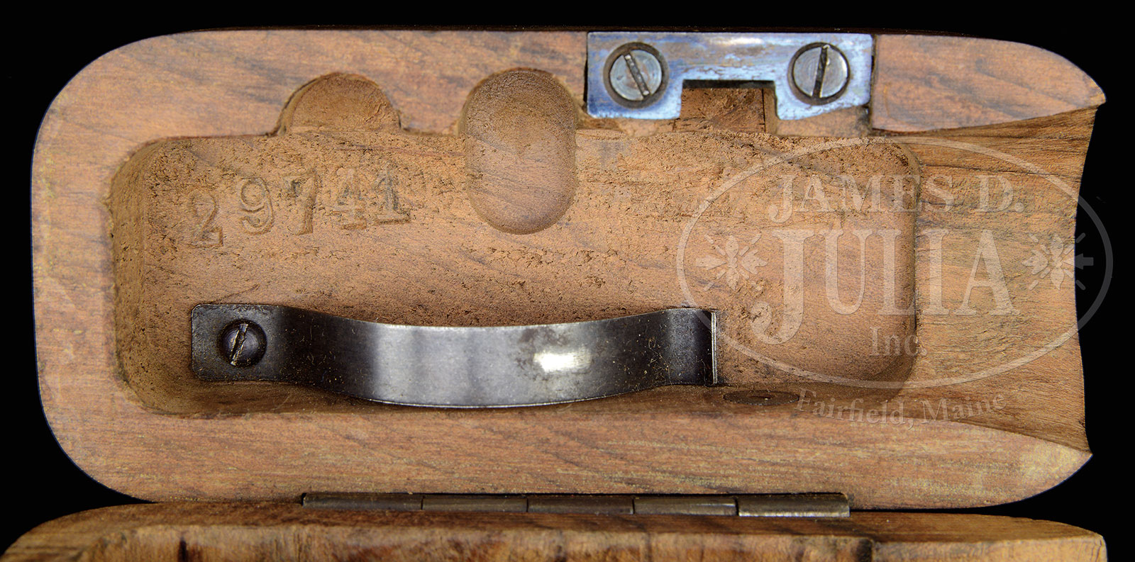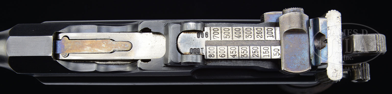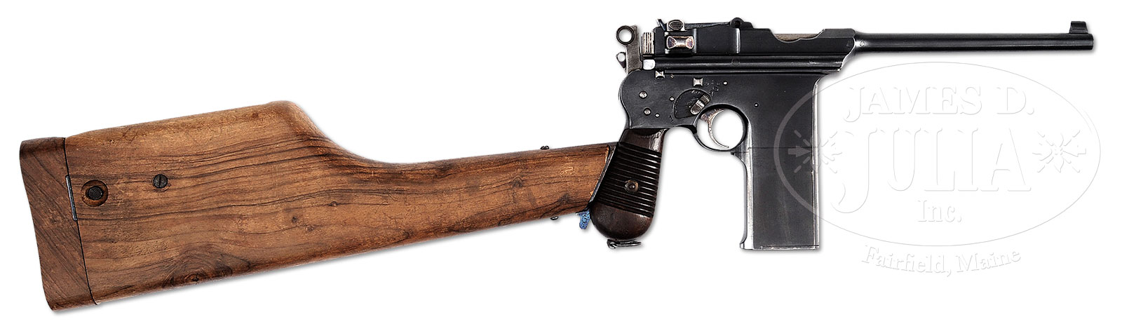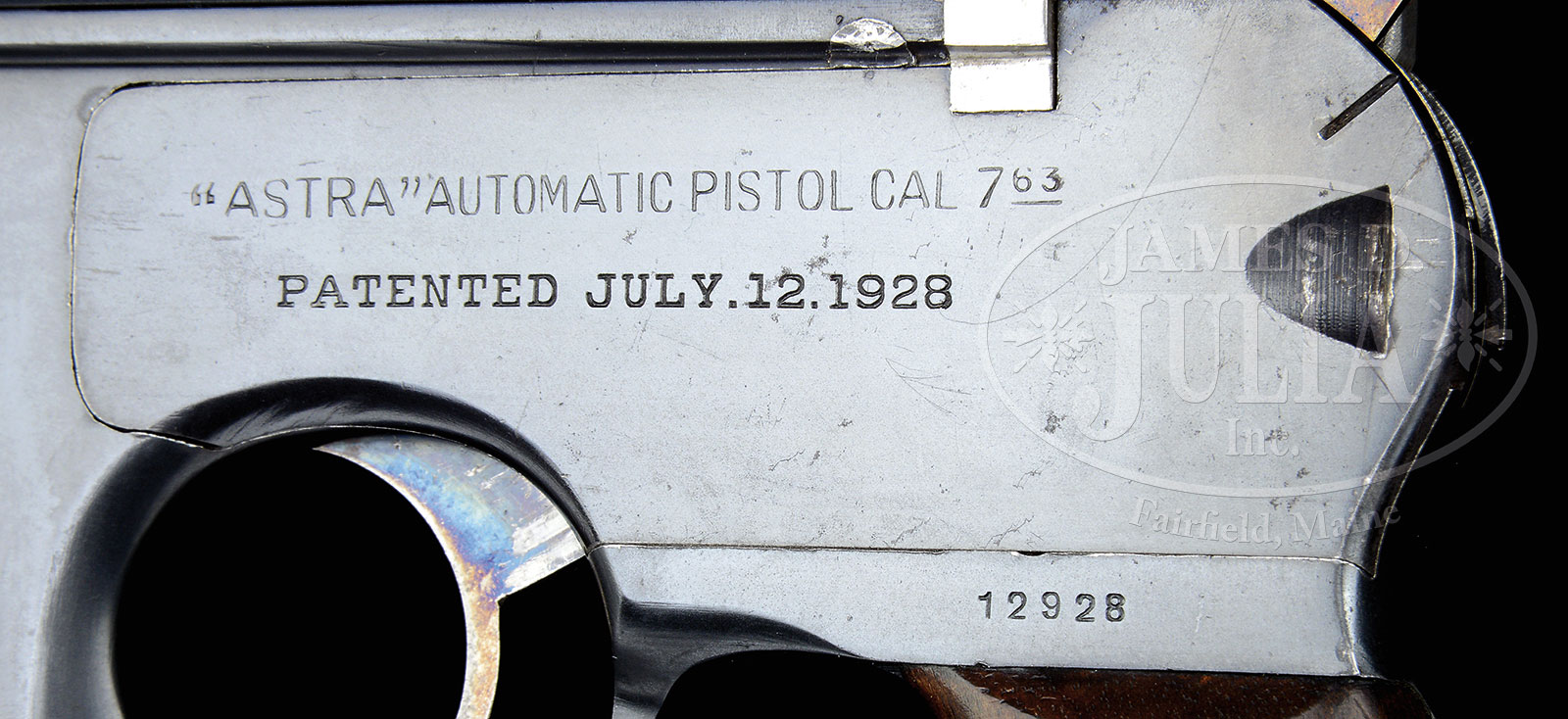 SN 12928. Cal. 7.63mm. 7-1/8″ bbl. Incredibly scarce and in high condition, Amnesty registered Astra Model 902 fixed mag, broom handle machine pistol with non-matching wooden stock (SN 29741). Gun marked on lefts side of frame “ASTRA AUTOMATIC PISTOL CAL 7.63” with patent date, right hand side has selector lever with Spanish proof marks present. Receiver SN is the only visible SN. Orig Amnesty registration form is included as provenance, as well as orig documentation where this gun was ordered from Astra in 1960, unaltered with the fire control lever shipped separately. This orig selector lever and sear in its orig packaging are present and included with this lot. The orig manual for the Astra Model F in its orig envelope dated November, 1960 is also included. Also included is the applicants copy for the license to import this very gun. Apparently the orig registrant requested a leather carrier, however a postcard from the Astra representative indicated they were out of stock. The original registrant was apparently a very discerning collector and alert to implementation of the Amnesty in 1968, which has provided this gun to be available to collectors. This is a National Firearms Act item and requires BATF approval for transfer. This item is fully transferable on an ATF form 3 or 4 as Curio & Relic eligible. CONDITION: Overall appearance and finish is extremely fine orig finish with some tiny pin prick oxidation on the fixed mag housing and some slight scratches on the bbl with a touch of muzzle wear. Wood is very fine with some slight handling marks. Nitra blue still present on stock latch which exhibits SN 47. Traces of color case hardening visible on trigger and rear sight elevator. Mechanics are crisp and although not test fired is likely in semi-auto as the orig selector lever and sear are not currently installed, and included. Bore is very fine, bright, and shows very little use. Orig documentation is extremely fine on very thin paper with orig postage stamps and address. The Astra 900 series was designed as competitor to the Mauser market in late 1927. These pistols are very high quality, machined from top quality materials and finished and fitted to compete with their Mauser counterparts. The Model 902 utilized the same frame as the earlier 900 and 901 with an additional mag piece attached below the frame, making it look like the Mauser 20 shot. This gun was only produced from 1928 until 1933, with a total of only just over 7000 guns ever produced encompassing both semi-auto only and select fire models. When the competition started marketing detachable box mag fed select fire guns it spelled the end of the 902 with its fixed mag. This specimen with its stock and especially its provenance is one of the very few and probably one of the most desirable of its kind registered for private ownership in the United States. This cataloger had never seen anything that comes anywhere close to comparison in terms of condition combined with provenance. 52690-1 JWK (10,000-20,000) C&R – Lot 2127