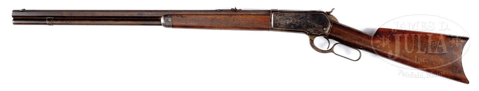 WINCHESTER MODEL 1886 SMOOTH BORE LEVER ACTION RIFLE WITH BROWNING BROTHERS MARK ON BARREL.SN 18449. Cal. 45-90. Standard grade rifle with 26″ oct bbl, smooth bore, full magazine, altered front sight and a replacement King rear sight. The replacement rear sight is lower than the original which necessitated lowering the front sight and also caused the owner to cut a small groove in the top of the receiver ring to permit a sight line. The bore measures .458″ at the muzzle indicating that it was probably bored out after leaving the factory. Top flat of bbl is marked with the 2-line Winchester address and is also marked “BROWNING BROS, OGDEN U.T.” between the rear sight & bbl address. John Browning was the world’s most prolific firearms inventor who designed many of the Winchester rifles including this one. He and his brother maintained a manufacturing facility and sporting goods store in Ogden, UT and were distributors for Winchester Arms. Most of the arms sold by Browning Brothers saw extreme hard use on the American frontier and are rarely found today in any condition. Those few rifles that come to market usually have little or no finish. CONDITION: Fair. Traces of orig finish remain in the most sheltered areas being an overall mottled silver/brown patina with wrench marks on the bbl over the chamber area. Receiver, lever & hammer retain traces of silvered case colors, being mostly an overall dark brown patina with a series of what are probably vise marks on the front raised area of the receiver. Wood is sound with numerous nicks, dings & scratches with gouges on the buttstock and another on the forearm and overall shows very hard wear with a hand worn patina. Mechanics are fine, strong bright bore. 52699-3 JRL (2,000-3,000) – Lot 1091