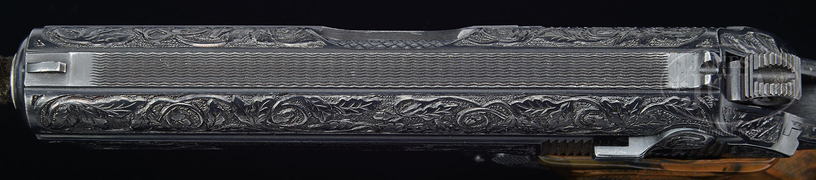 *OUTSTANDING RELIEF ENGRAVED PRESENTATION WALTHER PPK PISTOL WITH CASE.SN 276416K. Cal. 32. 3.3″ bbl. Blue finish overall profusely engraved in Walther’s acorn and oak leaf scrolls amounting to full coverage. Eagle N proofed with 1-pc mottled brown Walther grips. Inclusive to the engraving is a crest on front strap with a stylized “S” over “W”. 60 degree safety with traditional Walther Banner and nomenclature of left side of slide. A small “020” is found under grips of bottom left of frame, undoubtedly a special assembly number. Walther engraved more side arms during the WWII conflict than any other manufacturer. Their artistry and presentation have always been noted as being the finest. This example would be at the top of its field for embellishment and condition. Additional research truly needs to be done as to whom the “SW” crest would be identified to. Gun is cased in a contemporary velvet and satin lined blue Walther display case. CONDITION: Extremely fine, with a very minimal amount of finish loss at leading edges of muzzle and on right side of frame behind trigger. Bore is bright and shiny. Mechanics are crisp. Walther grips are very fine with very minor warpage. Finger rest magazine equally fine with no issues. 52700-10 TDW (6,000-10,000) C&R – Lot 2033