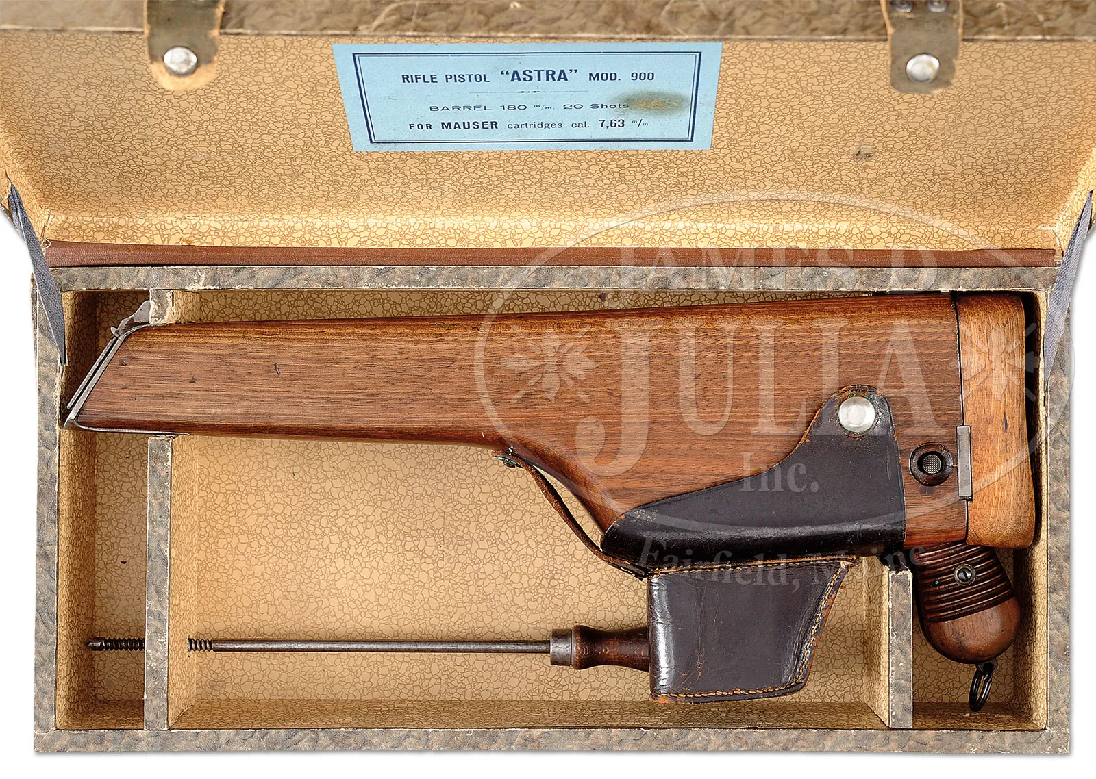 *EXTREMELY RARE 20 SHOT ASTRA MODEL 900 SEMI-AUTOMATIC PISTOL WITH HOLSTER/STOCK AND ORIG ASTRA BOX.SN 26705. Cal. 9mm. 7″ bbl. Blue finish, walnut grips. Very rare Astra Model 900 Semi-Automatic Pistol. Manufactured primarily for export to China, the Astra Model 900 superficially resembled the M 1896 Mauser Pistol. This Model 900 Pistol was manufactured in 1933 and features the same 7″ barrel and 20-round, fixed, magazine as the Model 902 Select-Fire Automatic Pistol. It is complete with holster/stock serial numbered to the pistol, steel cleaning rod with walnut handle and the original factory case. The pistol has a highly polished, rust blue, finish. The rear sight elevator slide, extractor, safety lever, trigger and other small components have a nitre-blue finish. The bolt, hammer, and rear sight are polished bright. The walnut grips are the final pattern with twelve deep grooves on each panel. The tangent rear sight is graduated to 1000 yards. The bottom of the frame is fitted with a lanyard ring. The left side of the frame is marked with the style, three-line “GUERNICA” address. The right side of the frame is stamped with the factory proof mark, year code and automatic pistol proof. Two additional automatic pistol proofs are stamped on the right side of the barrel extension and barrel. SN 26705 is located on the left side of the frame just above the grips. The holster/stock is straight grained walnut and features the distinctive russet leather boot which snaps over the extended, 20-round magazine. The pistol serial number is stamped inside the stock lid. The pistol is complete with a factory wood and cardboard case. The case lid and sides are cardboard with a simulated marble exterior cover and pebbled interior. The cardboard surrounds a wooden frame with three compartments. On the inside of the lid is a blue label that reads: “RIFLE PISTOL ‘ASTRA’ MOD 900/BARREL 7″, 20 Shots/FOR MAUSER cartridges cal. 7.63 m/m” in three lines. The case is complete with a cleaning rod with hardwood handle and 8-inch steel shaft. The great majority of Astra Model 900 series pistols were exported to China and most of the remainder were utilized in the Spanish Civil War. Surviving examples are scarce in any original condition. CONDITION: Extremely fine. All visible numbers matching and mechanics are crisp. The pistol retains at least 98% of the original, high polish, rust-blue finish. Small components have most all of the nitre-blue. All markings are extremely sharp. The bore is pristine. The grips are in excellent plus condition with only very minor wear. the walnut holster stock is in excellent condition, the wood has only minor handling marks and two, very minor, hairline cracks that extend from the latch button to the latch spring screw. The stock hinge and lug have a gray patina finish. The case is in fine condition. The corners of the cardboard lid are broken and the edges and top of the lid have some scuff marks and finish loss. There is some edge wear on the bottom of the case. The leather fasteners are in fine condition. The case interior is excellent as are the lid and label. A finer example would be near impossible to find. 52700-31 TDW (30,000-40,000) C&R – Lot 2012