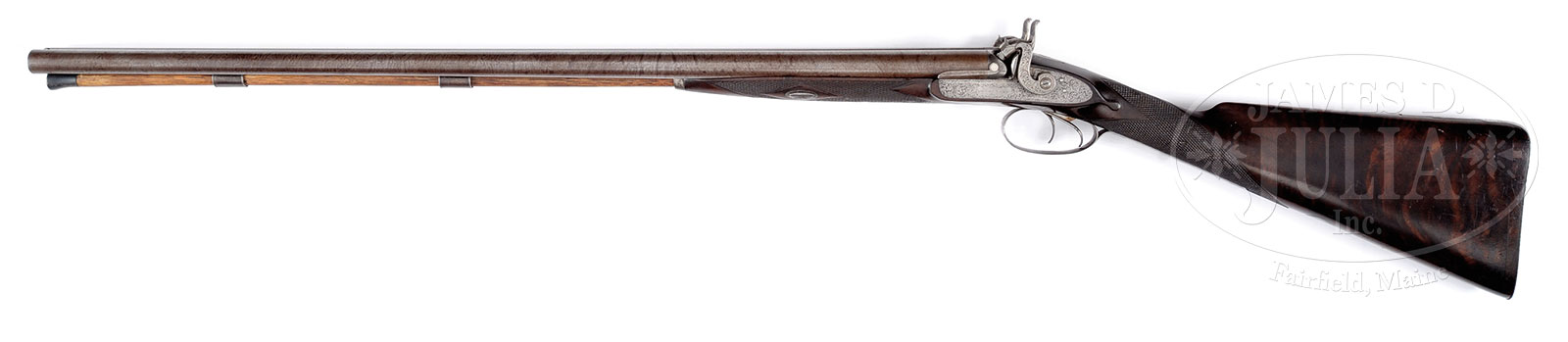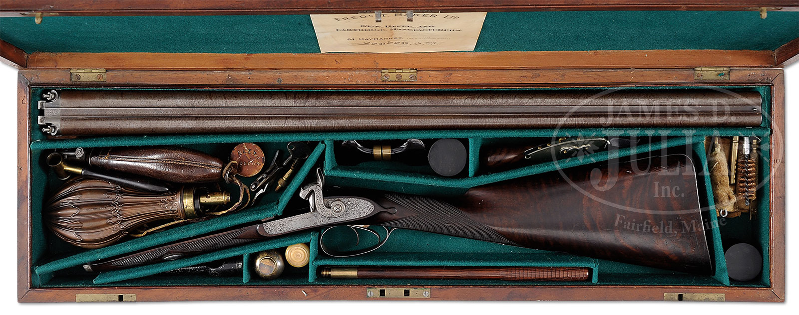 PERCUSSION DOUBLE SHOTGUN BY THOMAS K. BAKER WITH CASE.SN 1600. Cal. 14 bore. (.693 bore diameter). 30″ Skelp twist bbls are engraved “Thomas K. Baker 88 Fleet Street. London” on narrow game rib. Bottoms of bbls are stamped with London black powder proofs. Oak ramrod with brass head and tail is in two beaded pipes. Breech plugs have non-vented platinum blow-outs. Breech iron is nicely engraved with scroll and rose bouquet. Bar locks with flat faced serpentine dolphin head hammers are fully engraved with exceptionally well cut varying sized scroll around “Thomas K. Baker” on each plate. Trigger plate has “Prince of Wales” plume finial, thimble matches. Trigger guard has matching engraving. Nicely stump figured European walnut straight grip stock measures 14-3/4″ over steel buttplate with engraved long top tang with SN over 5/16″ lengthening piece. Stock is checkered at grip and forend and has a vacant silver circle on toe line. Drop at heel: 2-3/8″, drop at comb: 1-11/16″. Neutral cast. Weight: 6 lbs. 8 oz. LOP: 14-3/4″. Gun is accompanied by mahogany case with brass corners and D-ring handle with sliding latch closure, which is lined in green cloth, and has reproduction “Fred T. Baker” label in lid. Case contains a mix of new and old accessories with old leather shot flask, fluted and acanthus embossed powder flask by Dixon, and ebony handled powder measure. Newer accessories include a German silver capper, horn handled bow-tie turnscrew, cleaning rod, and round oil bottle. CONDITION: Good. Bbls retain most of their orig brown with good definition to interesting pattern. Locks are smooth with traces of their very subdued trace color where protected. Stocks have most of what appears to be their orig finish, with many light marks and scratches, perhaps refinished at time of addition of lengthening piece. Bores are shiny with scattered light pits. Locks are good. Case appears to have been refinished many years ago, has many marks. Interior cloth renewed. Accessories are good to fine. 52700-50 (3,500-5,000) – Lot 1553