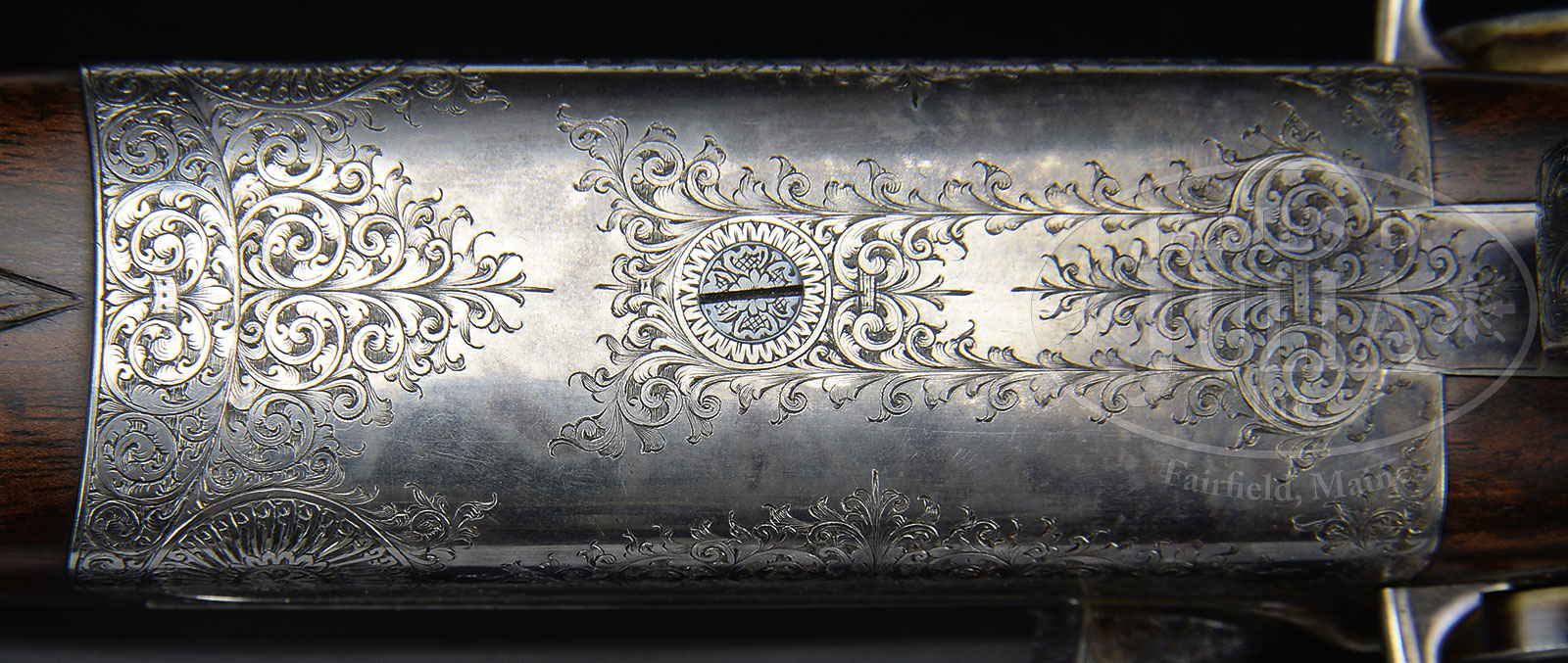 *FINE HOLLAND & HOLLAND TOP LEVER HAMMER DOUBLE RIFLE IN .375 – 2-1/4″ NITRO WITH CASE.SN 17632. Cal. .375 2-1/4″ Nitro. 28″ Dovetailed bbls fitted with quarter rib holding one standing two folding express rear, sunken mid rib, and matted ramp holding white bead front sight, are engraved with H&H New Bond street address and Field rifle trial information on tops. Bbl flats are stamped with London nitro proofs for 40 grains cordite and 270 grain bullet. Case hardened top lever action with top tang extending over comb, is fitted with rebounding peninsula back locks with flat faced serpentine hammers and front sliding stalking safeties. Action and locks are engraved with near full coverage exceptionally well cut medium to small shaded scroll within geometric borders. “Holland & Holland” is in strapwork device on each lockplate. Blued trigger guard with scroll on bow has SN on tang which extends to case hardened steel trap grip cap. Intricately marbled, dark European walnut pistol grip buttstock measures 14-7/8″ over ribbed horn buttplate, and features classic point pattern checkering and H&H style right hand shadow line cheekpiece. A gold oval on toe line is engraved “J. A. B”. Matching splinter forend has Anson release. Drop at heel: 2-3/4″, drop at comb: 1-7/8″. Cast about 1/4 off. Weight: 9 lbs. 10 oz. LOP: 14-7/8″. Rifle comes in an old leather Holland & Holland case with central brass medallion on top which is embossed “J. A. B.” Case is lined in blue cloth and has old paper H&H label in lid. Case contains an H&H marked round oil bottle and some fired brass made from .405 Winchester. PROVENANCE: Copy of ledger page confirming specifications and that rifle was made for “Burdeu”. CONDITION: Very fine, as partially refinished. Bbls retain nearly all of a London quality re-black with some scuffs and scratches. Action retains approx 80% orig case hardening color, silvered from normal handling around bottom, high edges, and fences. Locks retain traces of their color, hammers fairly strong. Stocks retain nearly all of a hand rubbed oil finish with light marks, checkering re-cut. Bores are good to fine, dark in grooves. Action is tight. Bbls are on face. Locks crisp. Safeties work. Case leather is very dark, considerably bumped and rubbed with repairs at ends. New straps are good. Repaired handle is good. Interior cloth has considerable deterioration with rubs and marks. Label considerably foxed, wrinkled, and soiled, with heavy rub through. 52700-52 MGM (15,000-25,000) C&R – Lot 1576