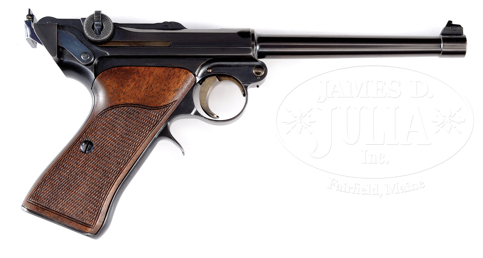 *FANTASTIC AND UNIQUE CASED DWM SINGLE SHOT TARGET LUGER.NSN. Cal. .30. 6″ bbl. Rich rust blue finish overall with straw finished safety, trigger, and takedown lever. Fantastic integral peacock blue finished rear adjustable sight with matching fine blade front sight. This unique single shot pistol has no provision to allow for the insertion of a magazine. Toggle marked “DWM” in script with unique locking lever to open and close toggle. Unusual sideplate design features an elongated sear bar, and an entirely different cocking assembly, entirely housed in receiver. Thumb rest, target stocks are 2-pc construction with single shot frame having a forward finger rest under trigger guard. A similar variation has been observed in .22 but never have we observed a .30 like this. Housed in a leather travel case with a 1939 Austrian shooting badge and similar identification plate is found pinned to interior of case. Cleaning tools, and screw driver are also accompanying this outfit. CONDITION: Very fine, with negligible finish loss at high points of muzzle and bearing surface of front of trigger. Bore is bright and shiny. Mechanics are crisp. Leather case exhibits a slight amount of distress on exterior corners and visible wear on carry handle. Interior and furniture are fine. 52700-55 TDW (5,000-10,000) C&R – Lot 2059