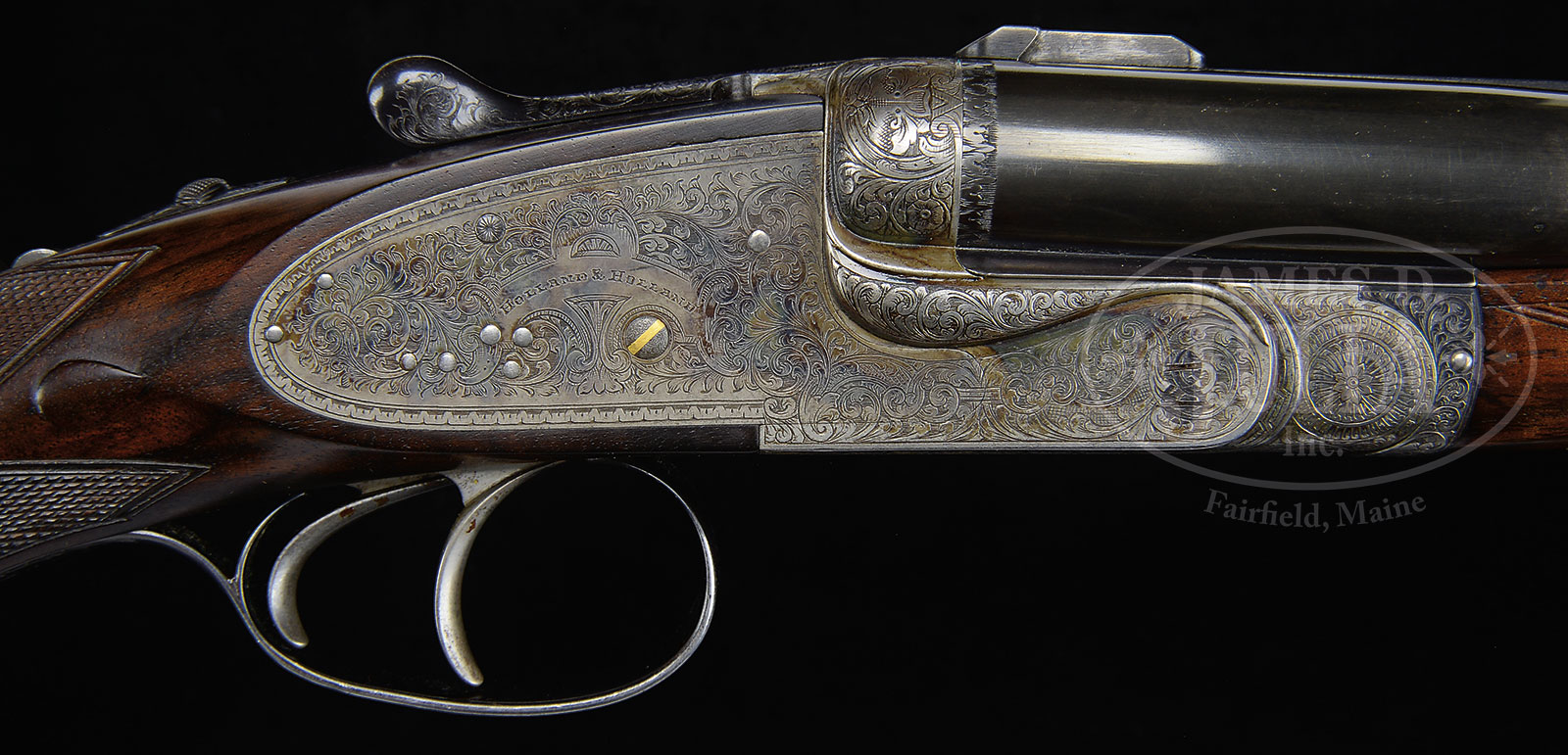 *”GOLDEN AGE” HOLLAND & HOLLAND “ROYAL” HAMMERLESS EJECTOR DOUBLE RIFLE WITH REINFORCED FRAME AND FOLDING PEEP SIGHT WITH SCOPE AND CASE.SN 35129. (ca 1937) Cal. .30 Super (flanged). 25″ Chopper lump bbls are fitted with file cut quarter rib holding two folding leaf express rear sight and fitted with H&H scope mounts. Mid rib is engraved “.30 “SUPER” Flanged Cartridges”. Front sight ramp is fitted with silver bead, and muzzles have late style regulating wedges and flip-over rear sight protector, which also acts as night bead. Tops of bbls are engraved “Holland & Holland” “98. New Bond Street, London”. Bbl flats are stamped with London nitro proofs for 44 grains cordite and 220 grain bullet. Bottom rib engraved “Made in England” under forend has soldered on sling loop. Slim case hardened “Royal” sidelock action with reinforcing bolsters has top tang which extends over comb, which is fitted with flip-up adjustable peep sight. Action also features non-automatic safety (SAFE inlaid in gold), hidden third fastener, bushed strikers, gold band tumbler end cocking indicators, dbl triggers, and hand detachable back locks by Brazier. Action and lockplates are engraved in classic “Royal” house style with well cut varying sized shaded scroll with some strapwork highlights. “Holland & Holland” is in usual device on each lockplate. Hinge pin cover is engraved “MADE IN ENGLAND” and bottom of action “Royal Model”. Blued single beaded trigger guard has scroll on bow and SN on tang, which extends to steel trap grip cap, with spare front sight in trap. Attractively broad fiddle figured and nicely marbled European walnut capped pistol grip buttstock measures 14-3/8″ over Silver pad, and features classic Holland styling and point pattern checkering, drop points, and shadow line right hand cheekpiece. A vacant gold oval and sling loop matching that on bbls, is on toe line. Matching splinter ejector forend has Anson release. A Hensoldt Diavari D 1.5 – 6 X rail scope with 30 mm tube and three post reticle is in Holland & Holland mounts, numbered to this rifle. Drop at heel: approx 3″, drop at comb: approx 1-3/4″. Cast approx 1/2 off. Weight: 8 lbs.15 oz. LOP: 14-3/8″. What appears to be orig leather case with stitched leather corners is lined in burgundy cloth, and has silver embossed black leather label in lid along with charge card for this particular rifle. Case contains cleaning equipment, snap caps, and a bone striker bottle marked with this guns SN, containing spare strikers, lock bridles, and lock pin. PROVENANCE: Copy of factory ledger page. Scope and peep sight not specified. CONDITION: Very fine, as partially refinished. Bbls retain most of their orig blue considerably worn to gray on sides. Action retains most of its orig case hardening color, silvered on high points and browned and lightly flecked on bottom. Lockplates retain over 80% of their color, left plate perhaps 90%. Stocks retain nearly all of a well done hand rubbed oil finish over some light marks. Checkering competently re-cut. Bores are very fine with strong rifling throughout, right bbl with a hint of erosion at throat. Action is tight. Bbls are on face. Ejectors are strong and in time. Scope has numerous marks and light scratches, optically clear. Case leather is fine with some marks and rubs. Straps and handle are good. Interior cloth is fine with some rubs and light soiling. 52700-57 MGM (35,000-60,000) C&R – Lot 1572