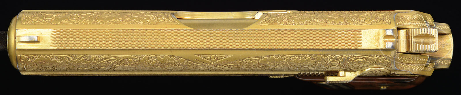 *HISTORIC NSDAP ENGRAVED CASED PRESENTATION WALTHER PPK PISTOL.SN 210985K. Cal. 32. 3.3″ bbl. Exquisitely engraved in the Germanic oak leaf and acorn motif. Executed to the highest degree of ability and detail with gold-plated finish overall with 1-pc mottled brown Walther grips with matching engraved and gold-plated escutcheons. A presentation plaque has been precisely inletted and pinned into the grips. The presentation is to “OTTO MARRENBACH zum 27 July 1942 H. Simon”. Otto Marrenbach born July 27 1899, had worked in the Steel Industry in upper management positions from 1921-1928. From 19296-1933, he was the director of the National/Socialistic daily newspaper. He joined the NSDAP in 1928, member no. 100 361. From 1933-1936, he worked as the manager of the NSDAP Employment Branch and German Work Front. This presentation pistol was presented by Heinrich Simon who became the assistant to the Reichsinspektor of the NSDAP in 1932 and later a member of the Reichstag. This historic presentation Walther is housed in its red Walther factory presentation box containing three Geco marked functioning cartridges and 1-pc wiping rod. Rarely is the opportunity to acquire a factory engraved gold-finished presentation Walther to a senior member of the NSDAP. CONDITION: Very fine condition, with slight thinning of gold finish on left side of slide and leading edges of rear grip strap, magazine base and high points of sights. Front of trigger has finish loss from handling, however, breechface retains most gold finish. It is doubtful this firearm was ever used very much and that most wear is from handling this elegant presentation. Bore is bright and shiny. Mechanics are crisp. Case has slight exterior distress. Interior lining is slightly soiled from age and bottom has indiscernible inscription. 52700-6 TDW (25,000-35,000) C&R – Lot 2026