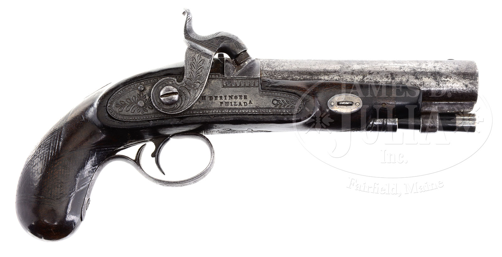 EARLY SINGLE SHOT PISTOL MARKED “H DERINGER PHILADA”.NSN. Cal. 45. This is thought to be an early Henry Deringer measuring 8-1/4″ overall with 3-7/8″ bbl with 2 platinum bands, horn tip. Only markings on iron mounted gun are “H DERINGER / PHILADA”. CONDITION: Very good overall. Appears orig and complete. Iron is a mottled grey/brown patina with pitting. Silver thumbplate and key-way escutcheons have silver/grey patina. Stock has hand worn patina, solid with heavy wear to checkering. Mechanics are fine with pitted rifled bore. 52707-7 JS (2,000-3,000) – Lot 3277