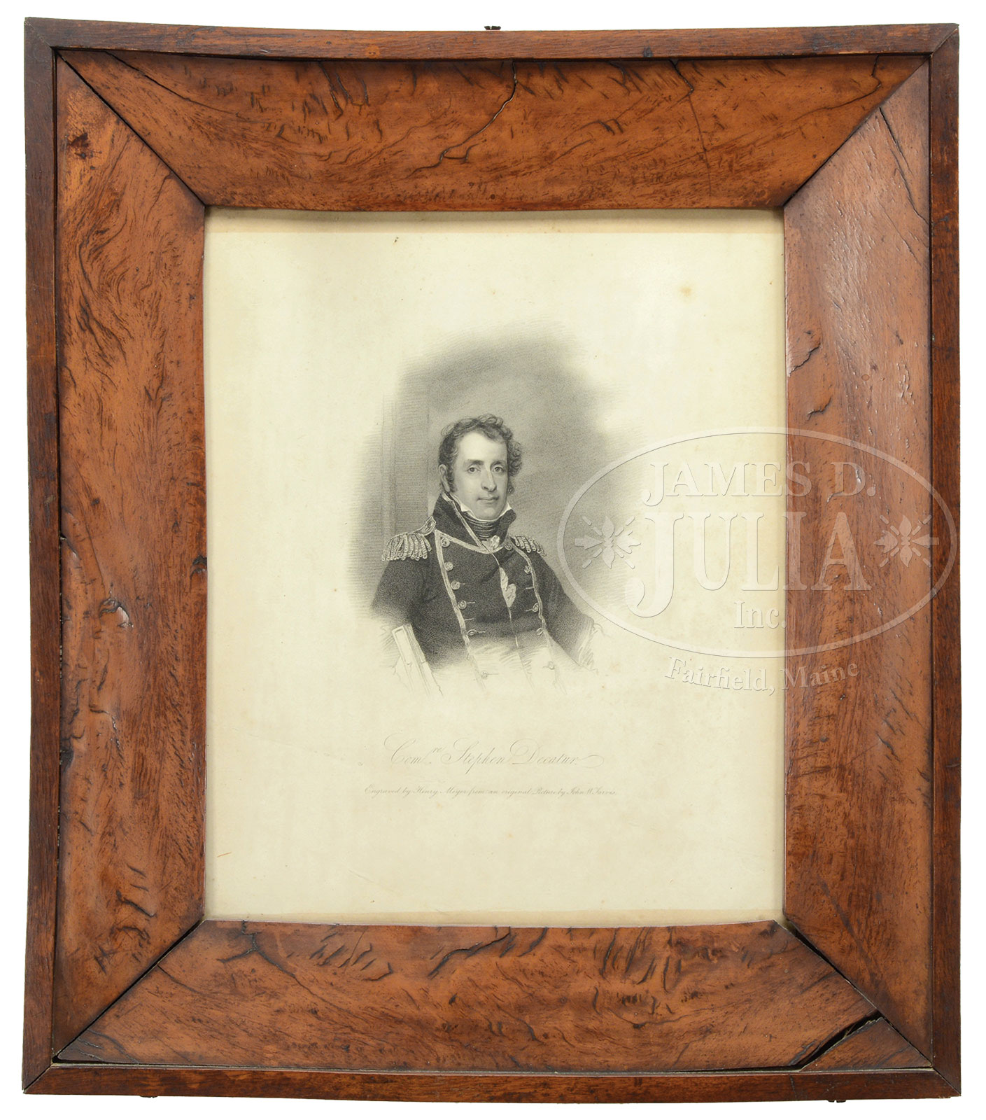 Please Note: Title should read “FRAME MADE FROM THE HATCH COVER OF HIS FRIGATE…” RARE CIRCA 1820 ENGRAVING OF STEPHEN DECATUR, FRAME MADE FROM DECKING OF HIS FRIGATE “UNITED STATES”.Framed steel plate engraving “Commodore Stephen Decatur / Engraved by Henry Meyer from an original picture by John W. Jarvis”. Wood backing of frame is inscribed: “This picture was given to my mother by General Page of Norfolk, VA. The frame is made of the hatch (live oak) of the Frigate United States“. Signed “Maria Susannah Decatur Mayo”. The frame has beautiful grain taken from the deck of the ship that made Stephen Decatur famous when he captured HMS Macedonian in the War of 1812. Wood in frame is quite dense with beautiful grain, weighing over 13lbs. SIZE: 12″ x 15″, exposed paper image. Overall:19-1/2″ x 23-1/2″. PROVENANCE: A most historical and important collection from the estate of Maria Decatur Mayo Deyo (Lila) Garnett of Kittery Point, Maine. CONDITION: Very good overall. There is light warpage to beveled lower frame panel and several age cracks as can be seen in photos. Backing of frame still retains screws, probably original to the ship. Engraving was not removed from frame, but is good overall with light staining and a few small streaks unaffecting aesthetics. 52714-59 (1,200-1,800) – Lot 2076 The estate of Maria Decatur Mayo Deyo (Lila) Garnett of Kittery Point, Maine has provided additional information on select lots. Click here to view the lots and their corresponding notes.