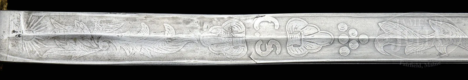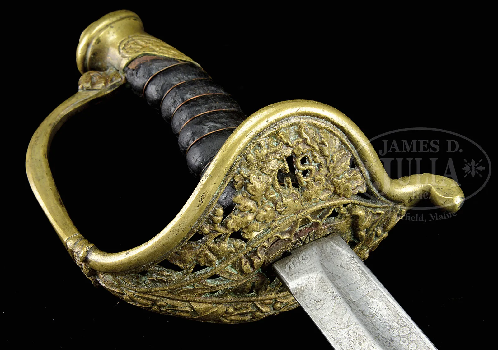 RARE AND FINE KRAFT, GOLDSCHMIDT & KRAFT CONFEDERATE STAFF OFFICER’S SWORD.This is among the most beautiful and desirable of Confederate staff officer’s pattern swords. There are probably less than 20 examples known and fewer that are all orig with complete orig scabbards with fine etched blades with full maker’s marks. At least one sword of this pattern is identified to a Confederate General, Joseph Kershaw. This pattern exhibits “CS” in a pierced guard of oak leaf and acorns. An identical pattern is pictured as fig. 21-A in William Albaugh’s text Photographic Supplement to Confederate Swords, 1960. The hilt, pommel, and knuckle guard are well finished with traces of gold plating. The grip is leather covered and wrapped with a single strand of copper wire. The blade is beautifully etched in 15″ panels on either side of foliate and patriotic design including a large “C.S”, cannon balls, crossed cannons, patriotic Confederate shield with flags and etched “K.G&K, Columbia SC”. The orig and correct scabbard is brazed with brass mounts with a matching patina to hilt. This is a fine example of a very rare Confederate sword and is the first complete and orig example to come to auction in many years. CONDITION: Very good overall. 32″ blade is gray overall with staining and a “bent” area about 5″ from ricasso showing an area where blade was possibly straightened though etched patterns are unaffected other than a few dents & tool marks as can be seen in photos. Hilt, pommel, scabbard mounts exhibit mustard colored patina where gold gilt is missing. Leather grip is dry and flaking but still appears about 90% intact including orig copper wire wrap. Scabbard throat missing one of its two retaining screws. Scabbard body is brown overall, pitted but smooth with discernible brazed line to overlapped construction, typical of this rare Columbia, SC manufacturer. Otherwise sword appears 100% orig and complete in every regard. 52716-1 (15,000-20,000) – Lot 1369