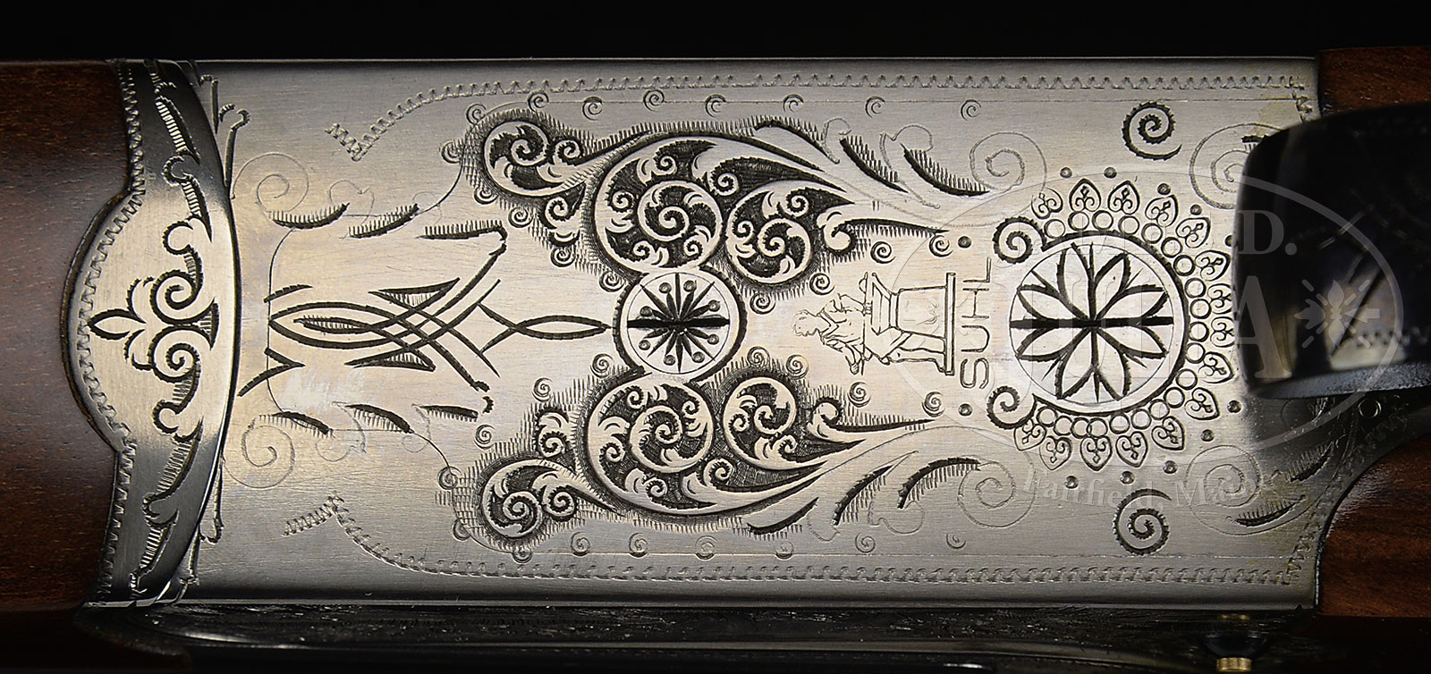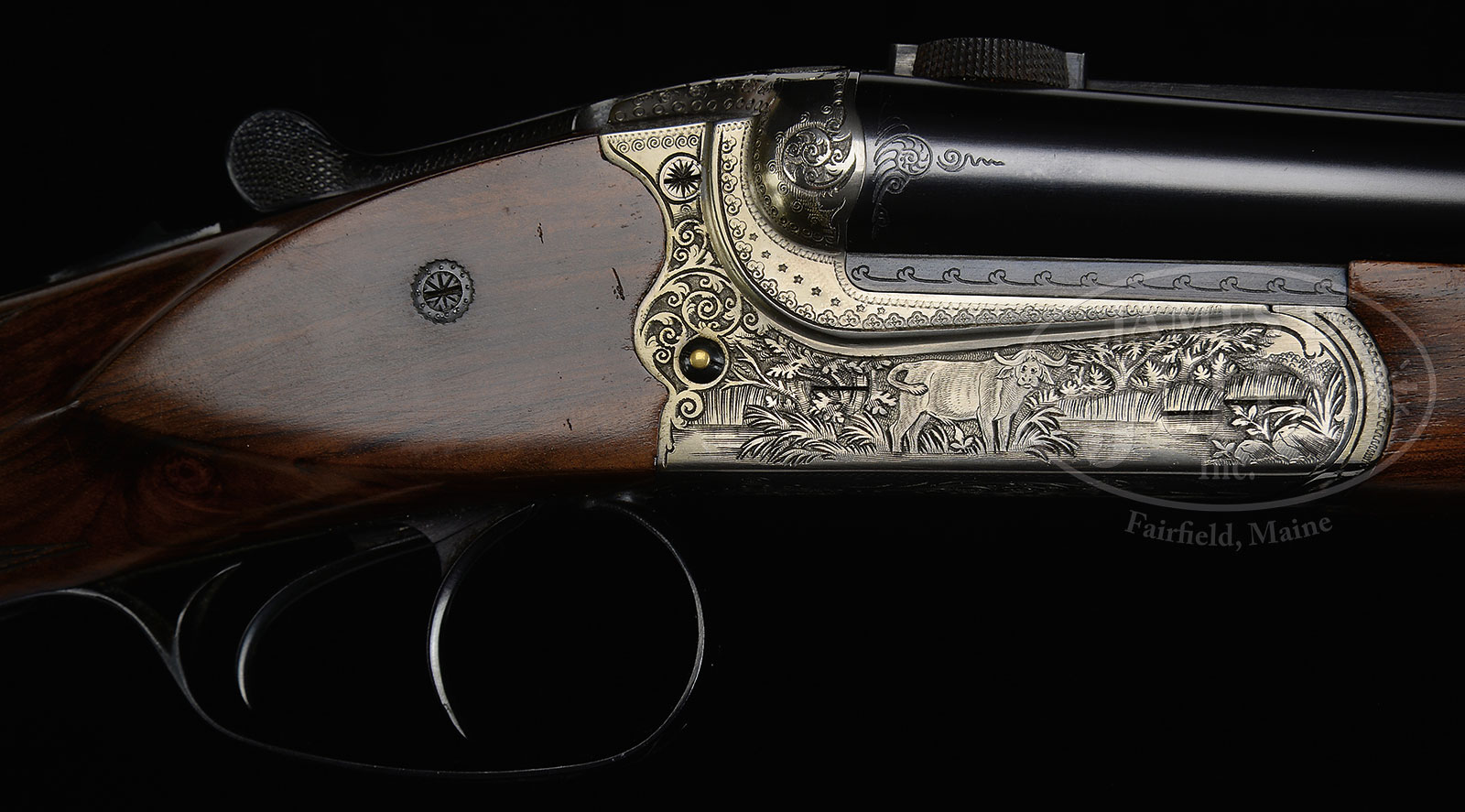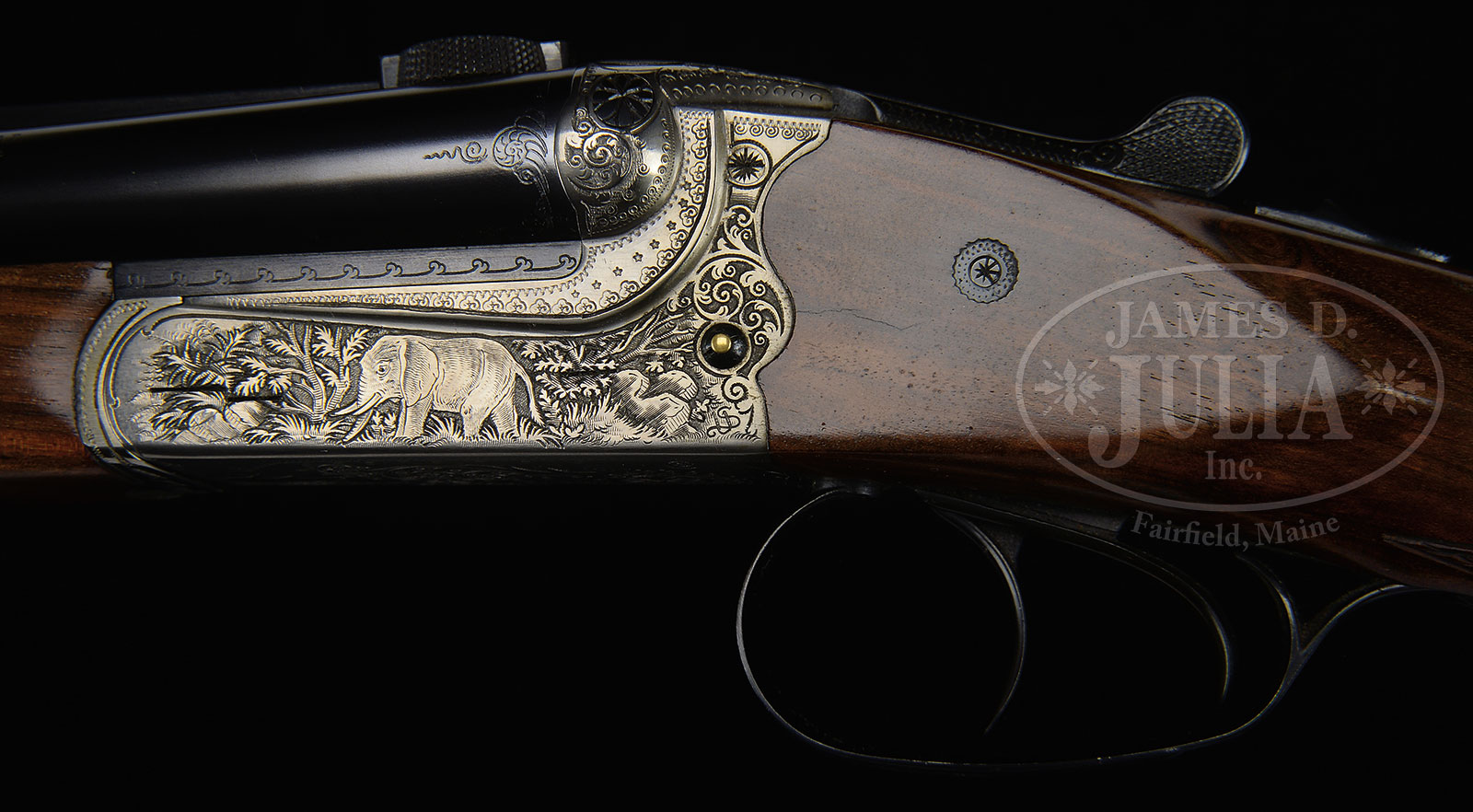 *MERKEL MODEL 140-2.1 DANGEROUS GAME DOUBLE RIFLE WITH CASE.SN A500031. Cal. 500 Nitro. 23-1/2″ Shoe lump bbls fitted with matted full length rib, central portion cut away forming quarter rib and front ramp. Rear portion has one standing, one folding leaf rear sight, and is fitted with claw scope bases. Bbl flats are stamped with SN, caliber and 2009 nitro proofs. Coin finished ogee backed action with non-automatic safety features crossbolt third fastener, bushed strikers, side clips, pin type cocking indicators, and dbl triggers. Action is engraved with stamped geometric borders and shaded scroll surrounding African game scenes on sides; elephant on left, and cape buffalo on right. Nicely figured dense European walnut capped pistol grip buttstock measures 15″ over brown Decelerator pad, and features right hand cheekpiece, point pattern checkering, and has been fitted with mercury recoil reducer. Matching splinter forend has Deeley type release. Drop at heel: approx 3″, drop at comb: approx 2″. Cast about 1/2 off. Weight: 10 lbs. 8 oz. LOP: 15″. Rifle comes in pebbled green vinyl brown leather trimmed case by Emmebi lined in green velvet with leather Merkel label in lid. Case contains a pair of claw rings (which fit rifle). CONDITION: Excellent, close to new, with scant evidence of having been fired, a few light marks on stocks. Case is fine, interior reconfigured. This model currently retails at approx $15000.00. 52720-1 MGM (6,000-9,000) – Lot 1712