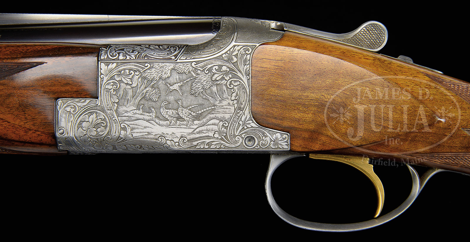 *20 GAUGE BROWNING SUPERPOSED “DIANA” GRADE SHOTGUN ENGRAVED BY DEWIL.SN 38150 V5. Cal. 20 ga. 26-3/8″ Bbls with narrow matted ventilated rib with ivory mid bead are marked for skeet and skeet. Coin finished superposed action with gold plated single selective trigger is engraved in typical “Diana” style with large semi-relief scrolling acanthus with shaded background surrounding game scenes on sides; five pheasant in open woodlands on left, and ducks mucking about in marsh on right. A pair of grouse fly across bottom of action , and two bunnies are on trigger guard bow. Engravers signature, Dewil, is at the bottom of the pheasant scene. Superb crotch figured American walnut long tang round knob buttstock measures 14-5/8″ over black leather covered pad. Point pattern checkering wraps over top of grip. Full forend matches well. Drop at heel: 2-1/8″, drop at comb: 1-7/16″. Weight: 6 lbs. 11 oz. LOP: 14-5/8″. CONDITION: Fine, as partially refinished. Bbls retain nearly all of what appears to be their orig blue, silvered on rib, with some flecking on sides. Action cleaned to maintain coin finish. Stock have old oil refinish. Checkering re-cut. Mechanically fine. Special Note: This item(s) contains plant or animal properties that may be covered by the Endangered Species Act (ESA). Please read the Conditions of Sale, section 15, for more information regarding the Endangered Species Act, and your responsibilities as a buyer. 52722-7 MGM (6,500-9,500) C&R; ESA – Lot 1674