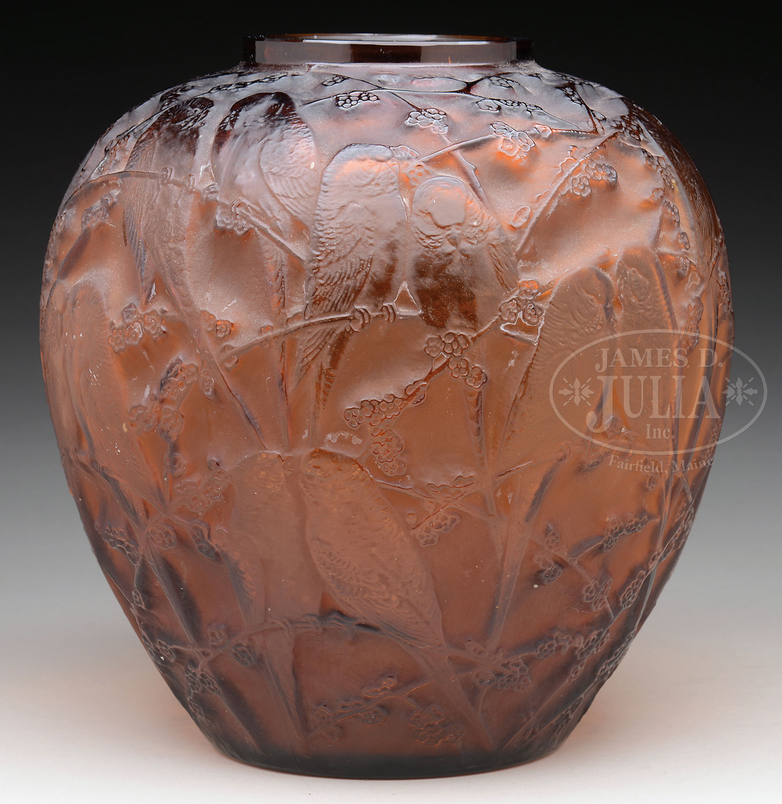 R LALIQUE PERRUCHES VASE.R. Lalique vase in the Perruches pattern has all over design of parakeet pairs resting on tree limbs with flowers adorning the limbs. The vase is done in rich amber glass and is signed on the underside with engraved script signature “R. Lalique”. Marcilhac #876. SIZE: 10-1/2″ t. PROVENANCE: From a private California collection. CONDITION: Very good to excellent. 52757-18 (10,000-15,000) – Lot 1226
