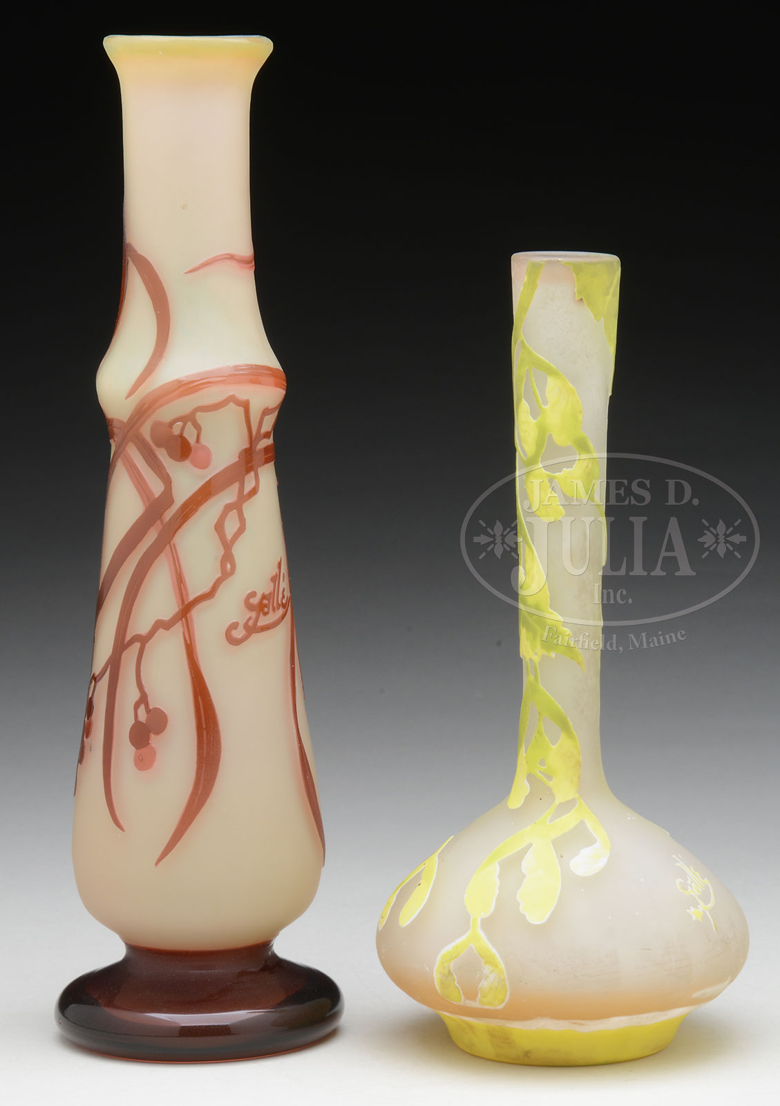 Please Note: One vase is a contemporary reproduction. TWO GALLE CAMEO GLASS VASES.1) Galle vase has translucent amber cameo glass leaves, vines and berries surrounding the tall slender vase all against a cream colored background. Signed on the back in cameo “Galle”. 2) Galle stick vase has yellow and green cameo decoration of leaves, stems and seed pods all against a frosted glass background. Signed on the side in cameo “*Galle”. SIZE: 1) 10-1/4″ t. 2) 8″ t. PROVENANCE: From an Unreserved San Diego, CA collection. CONDITION: 1) Very good to excellent. 2) Very good to excellent. 52757-25 (1,000-1,500) – Lot 1129