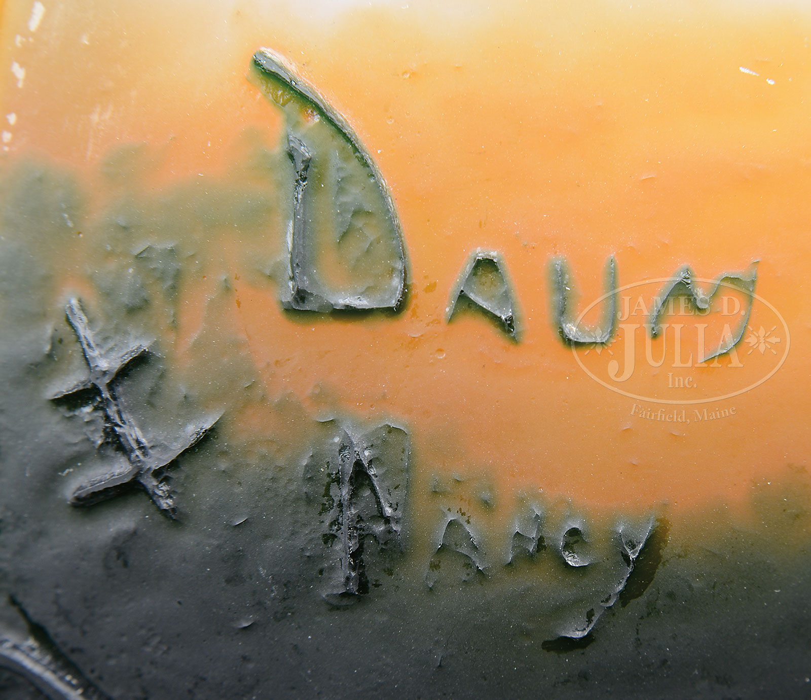 DAUM MOLD BLOWN VASE.Daum vase has large mold blown green leaves and stems descending from the lip against a white shading to light blue shading to orange shading to brown background. Vase is signed on the side in cameo “Daum Nancy” with the Cross of Lorraine. SIZE: 9-1/2″ t. PROVENANCE: From an Unreserved San Diego, CA collection. CONDITION: Very good to excellent. 52757-4 (6,000-9,000) – Lot 1006