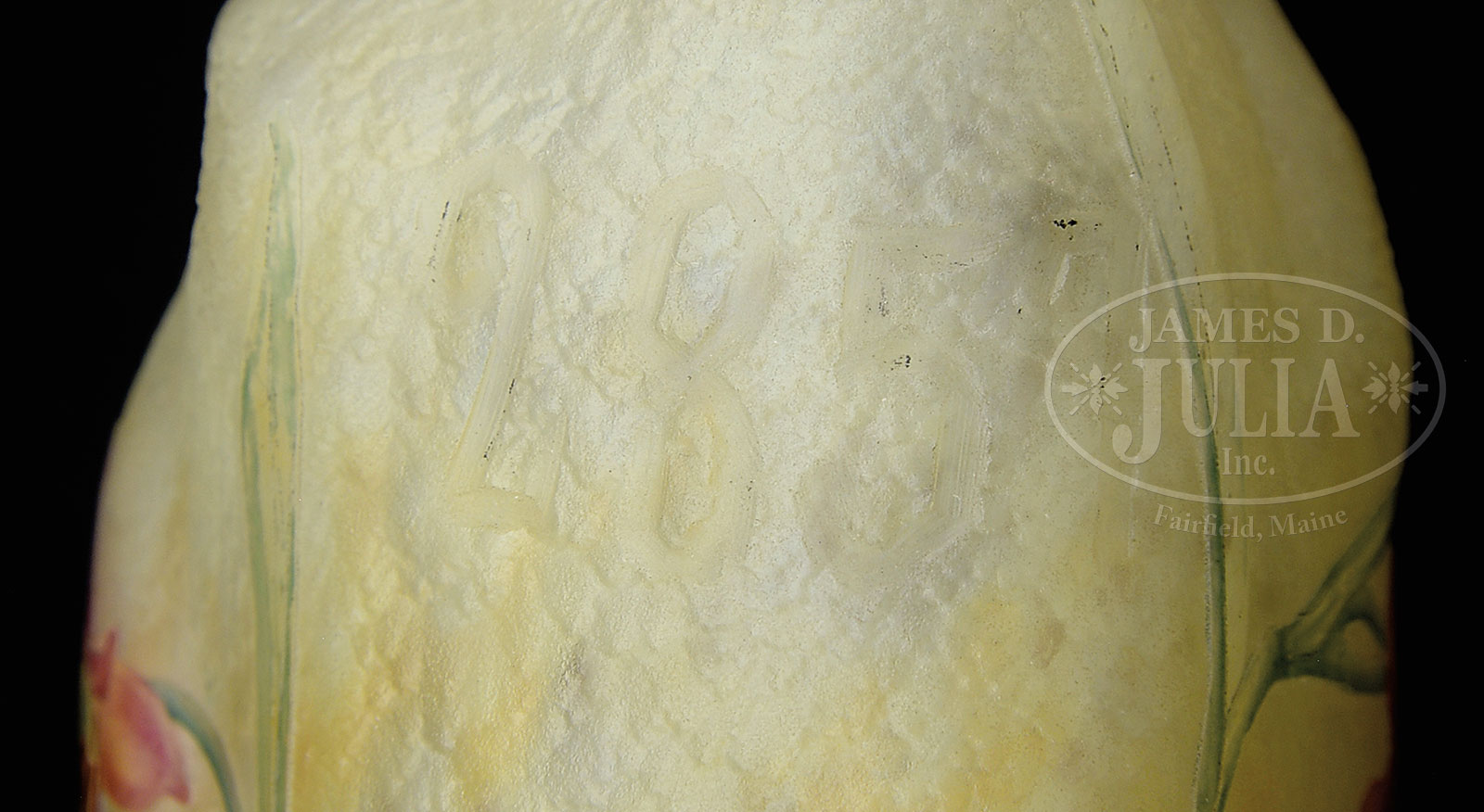Daum vase with quatrefoil base leading to a free-form organic mouth is decorated with cameo leaves, stems, and flowers. The cameo leaves and stems are enameled in shades of green while the flowers are enameled in shades of red. The vase is further decorated with a cameo and enameled bumble bee flying towards a flower. The vase is done in a paperweight technique with clear glass overlaid on the colored glass background. The clear glass is etched at the bottom depicting grasses giving the base a wonderful depth, and is finished with a gilded bottom rim. Signed on the underside with etched “Daum Nancy” with Cross of Lorraine and wheel-carved “2857” on back side of vase body. SIZE: 10″ t. PROVENANCE: From an Unreserved Connecticut collection. CONDITION: Very good to excellent. 52774-1 (6,000-9,000) – Lot 1005